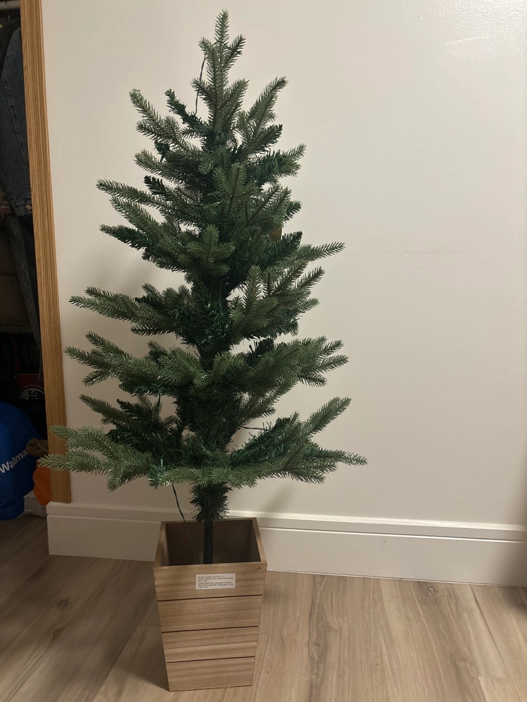 162Artificial Christmas tree in a wooden pot. Tree is approximately 3 feet tall. Includes lights. There is already a garland hanging on the tree. 120 centimeters Christmas tree. Christmas tree with a box.
