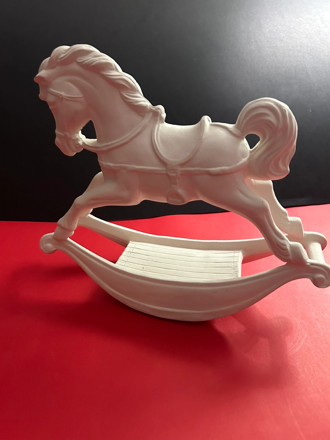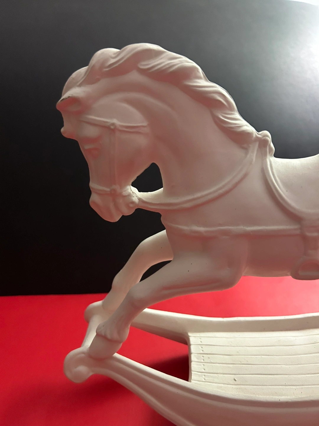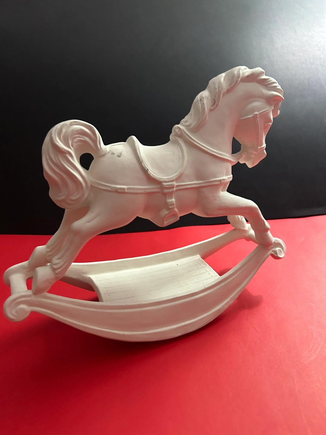 Small white rocking horse figurine. Could be used as a decoration or for a craft project. Measures 10” w x 8” h.