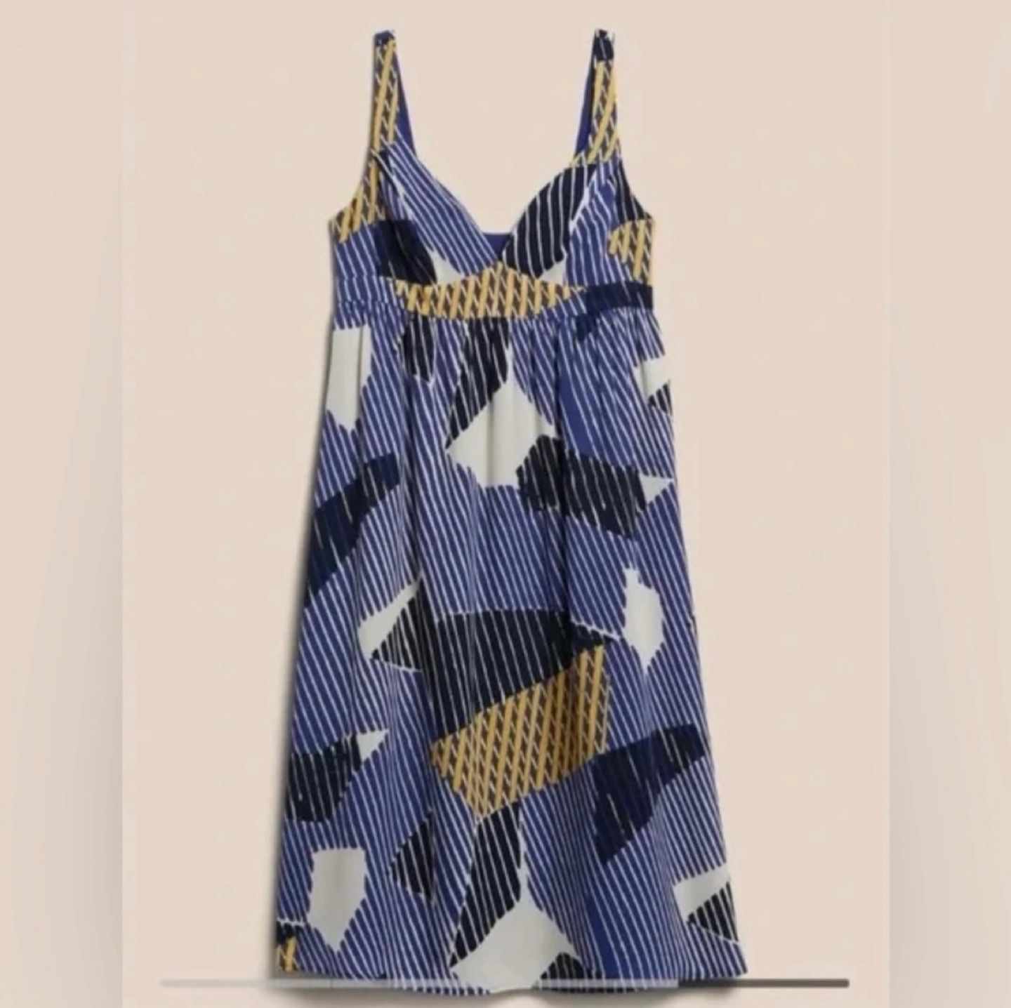 Sweetheart neckline. Sleeveless. Empire waist with shirring. Center back seam. Sweeping hem. Fully lined. Midi length. V-neckline. Made from a lightweight fabric with a geometric print.