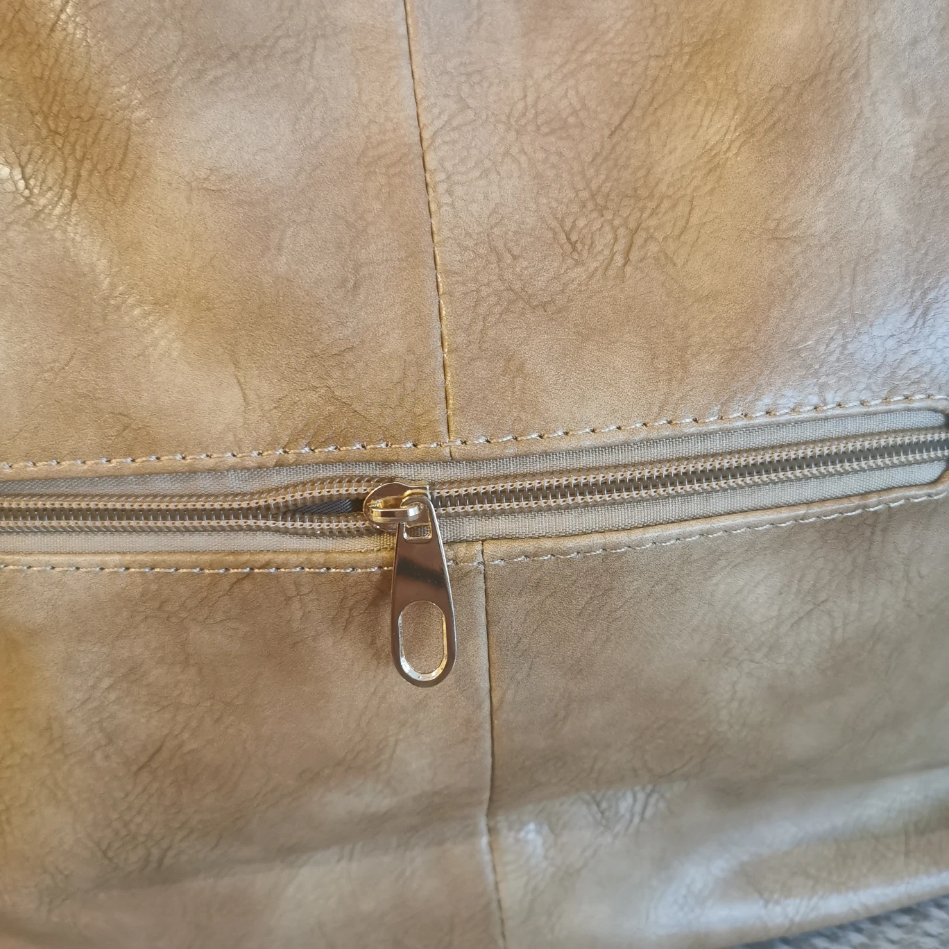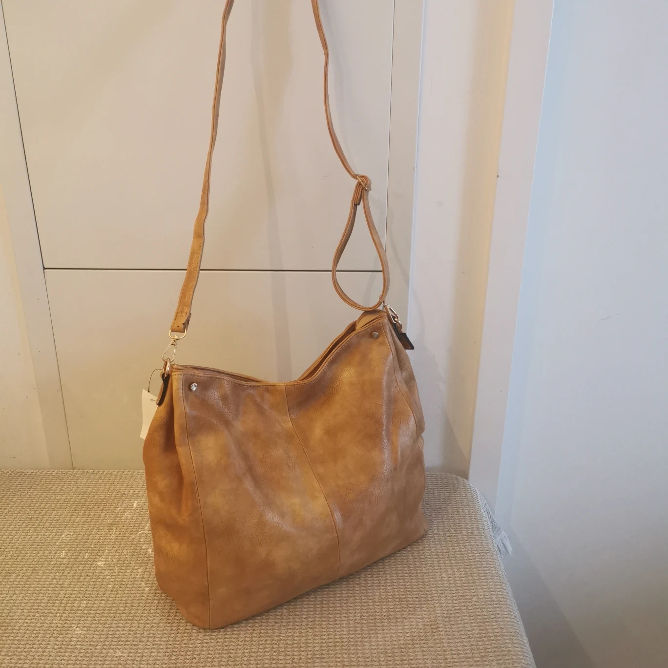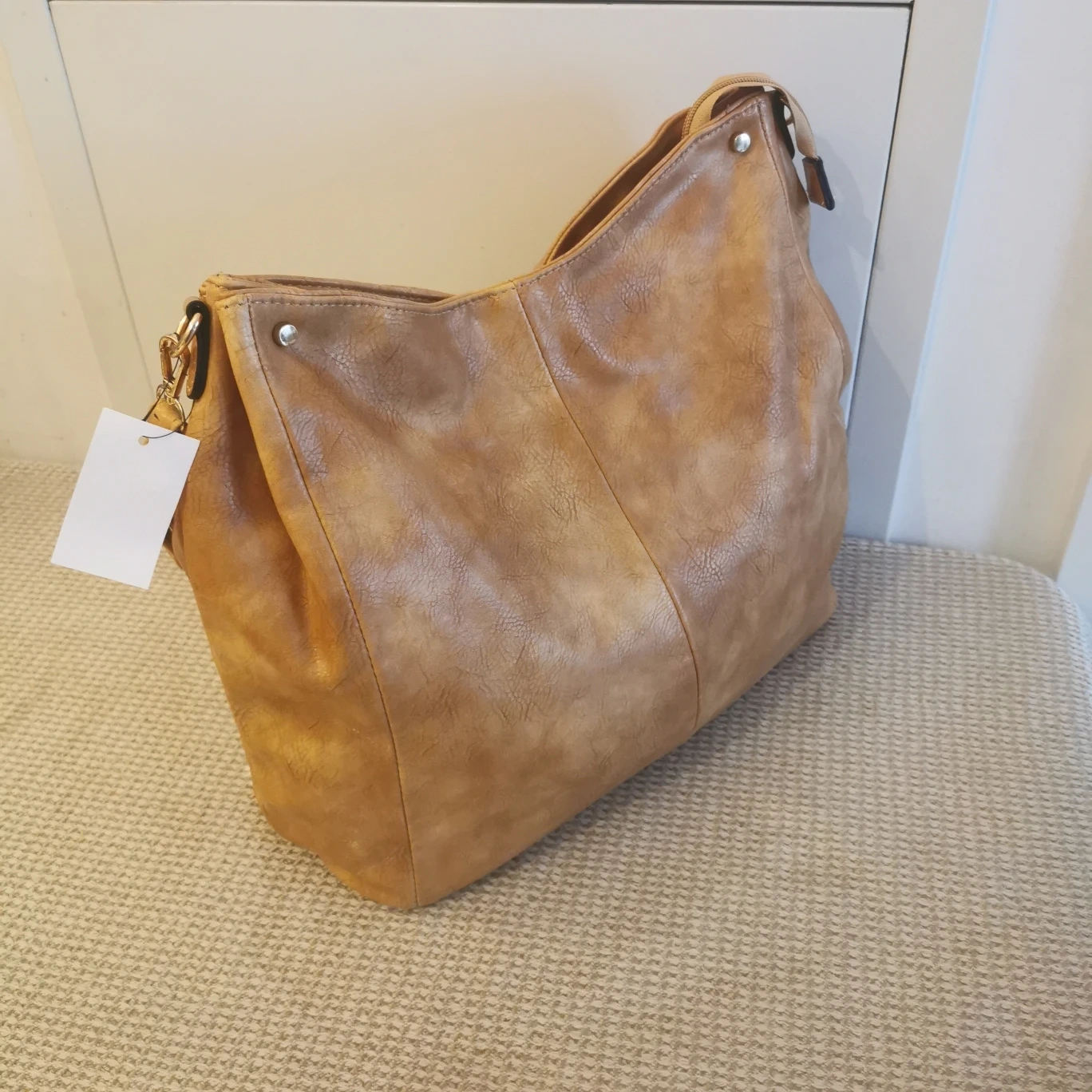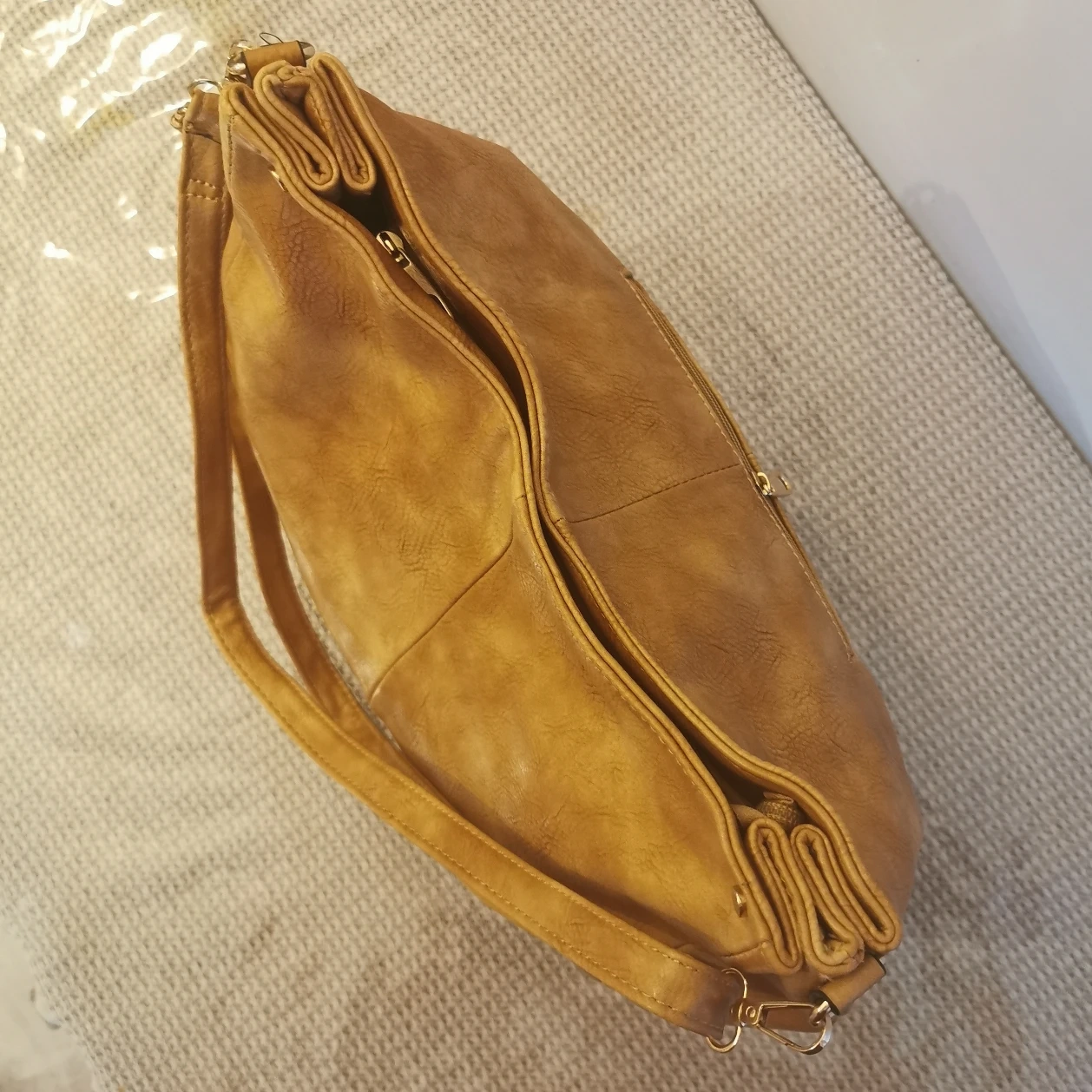 Large Torbee yellow leather bag with a zippered closure, a zippered pocket on the back, and a zippered pocket inside. It has a long adjustable strap for shoulder or crossbody wear. Gold hardware.
