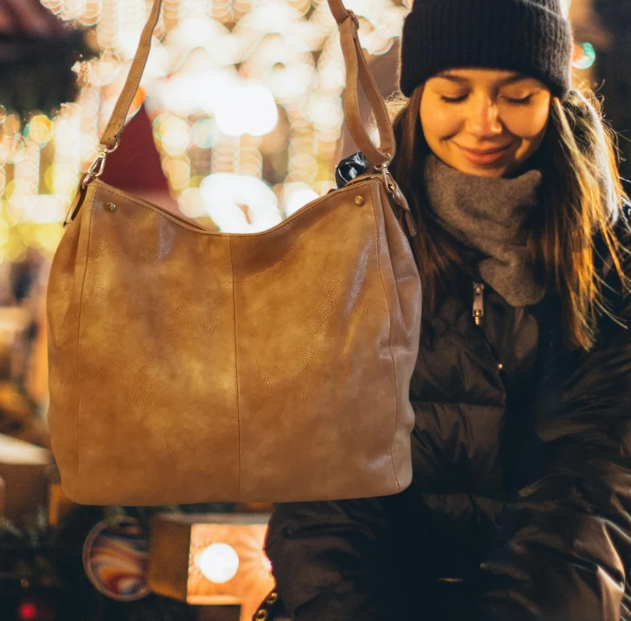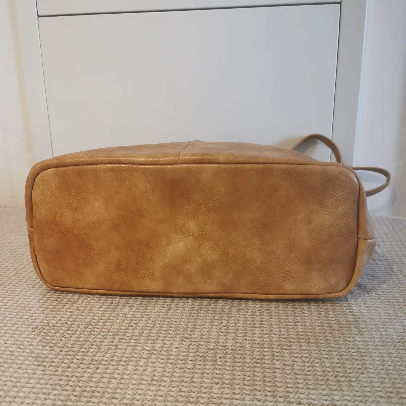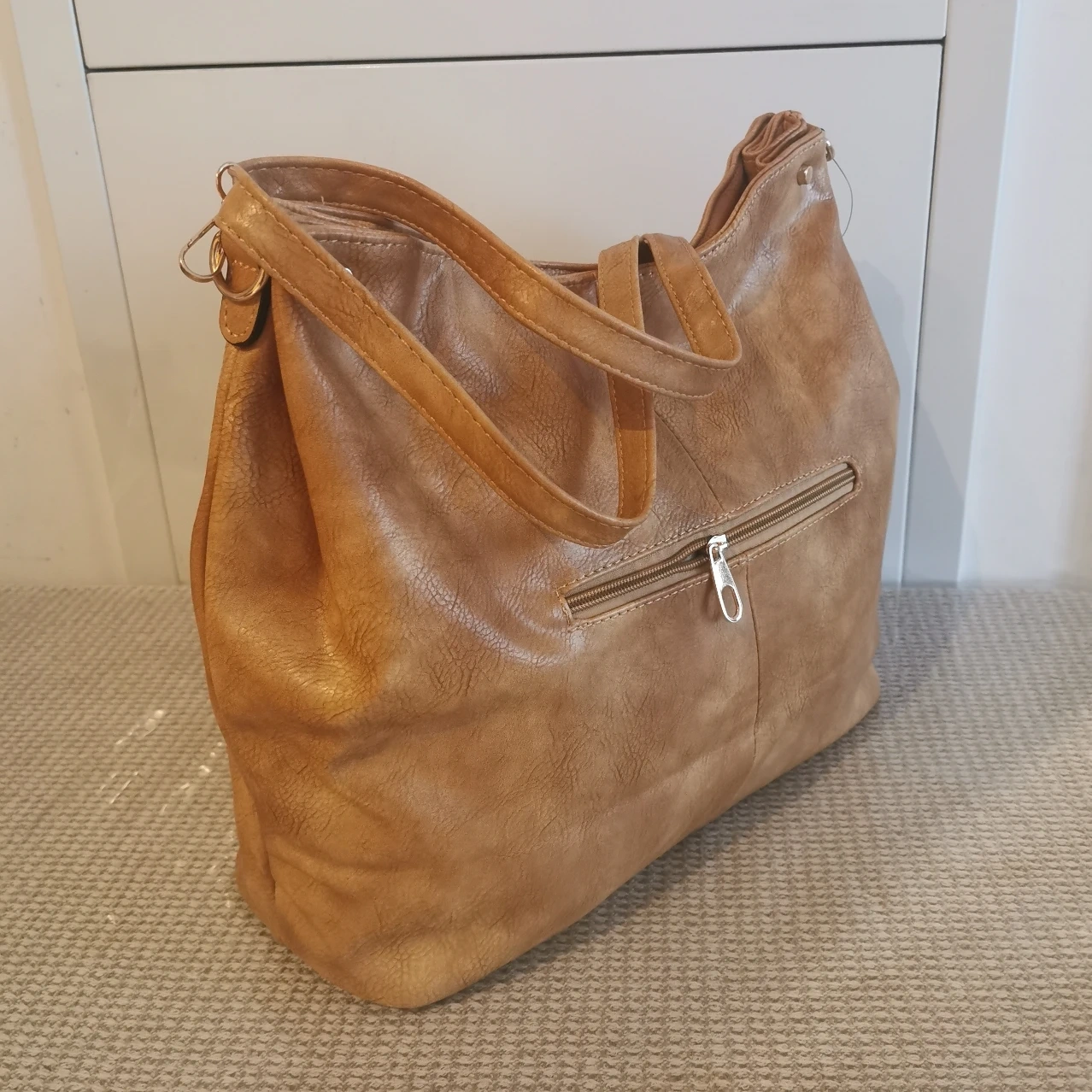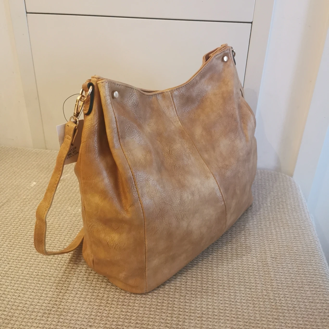 Large Torbee yellow leather bag with a zippered closure, a zippered pocket on the back, and a zippered pocket inside. It has a long adjustable strap for shoulder or crossbody wear. Gold hardware.