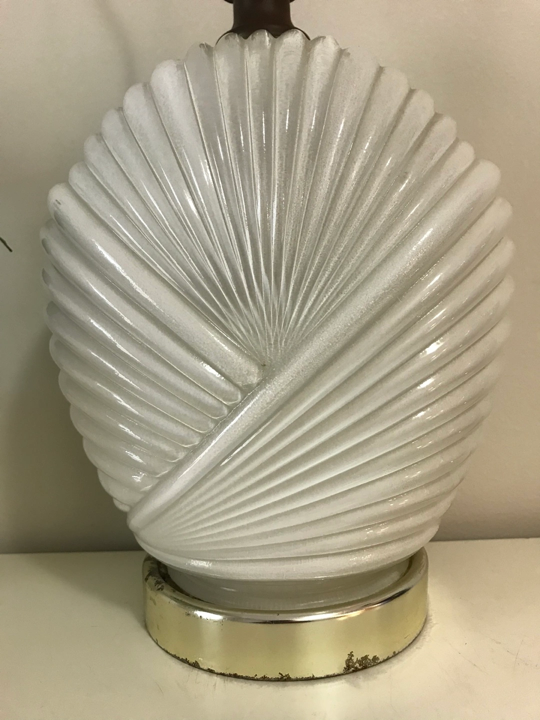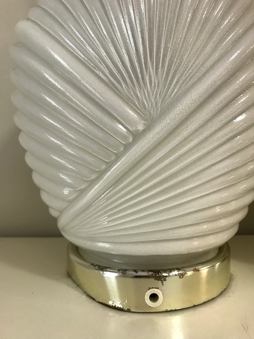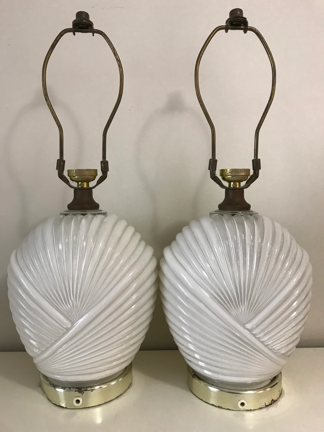 Pair of white glass lamps. Unique design with a ribbed glass shade. The shades are shaped like seashells. Sold as a pair. No bulbs included. Needs electrical wiring