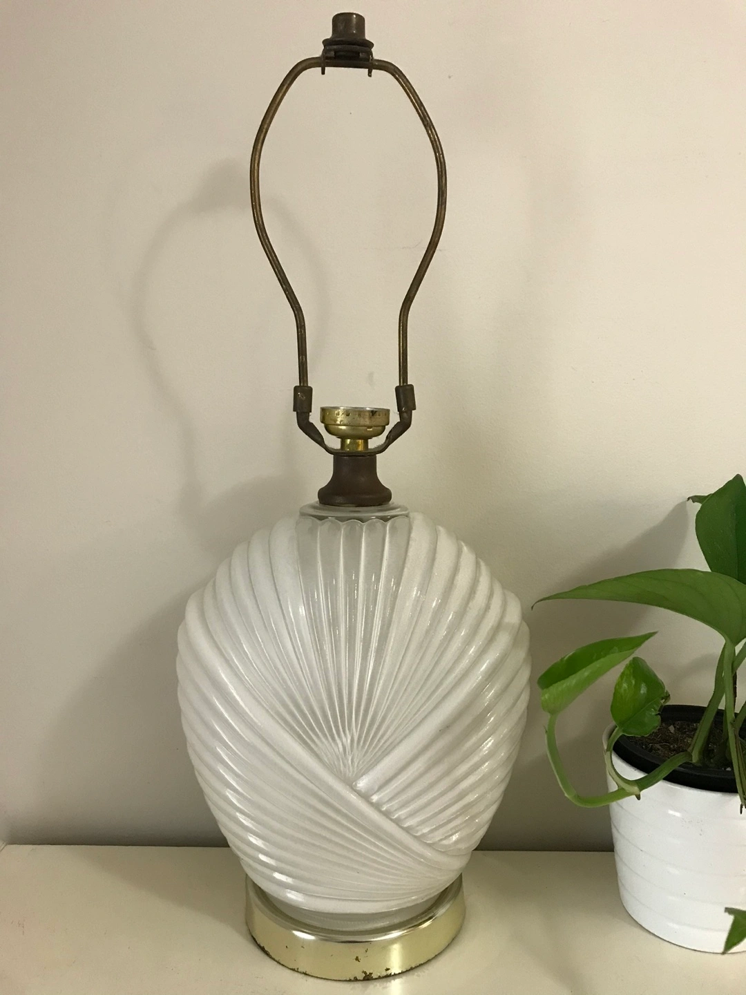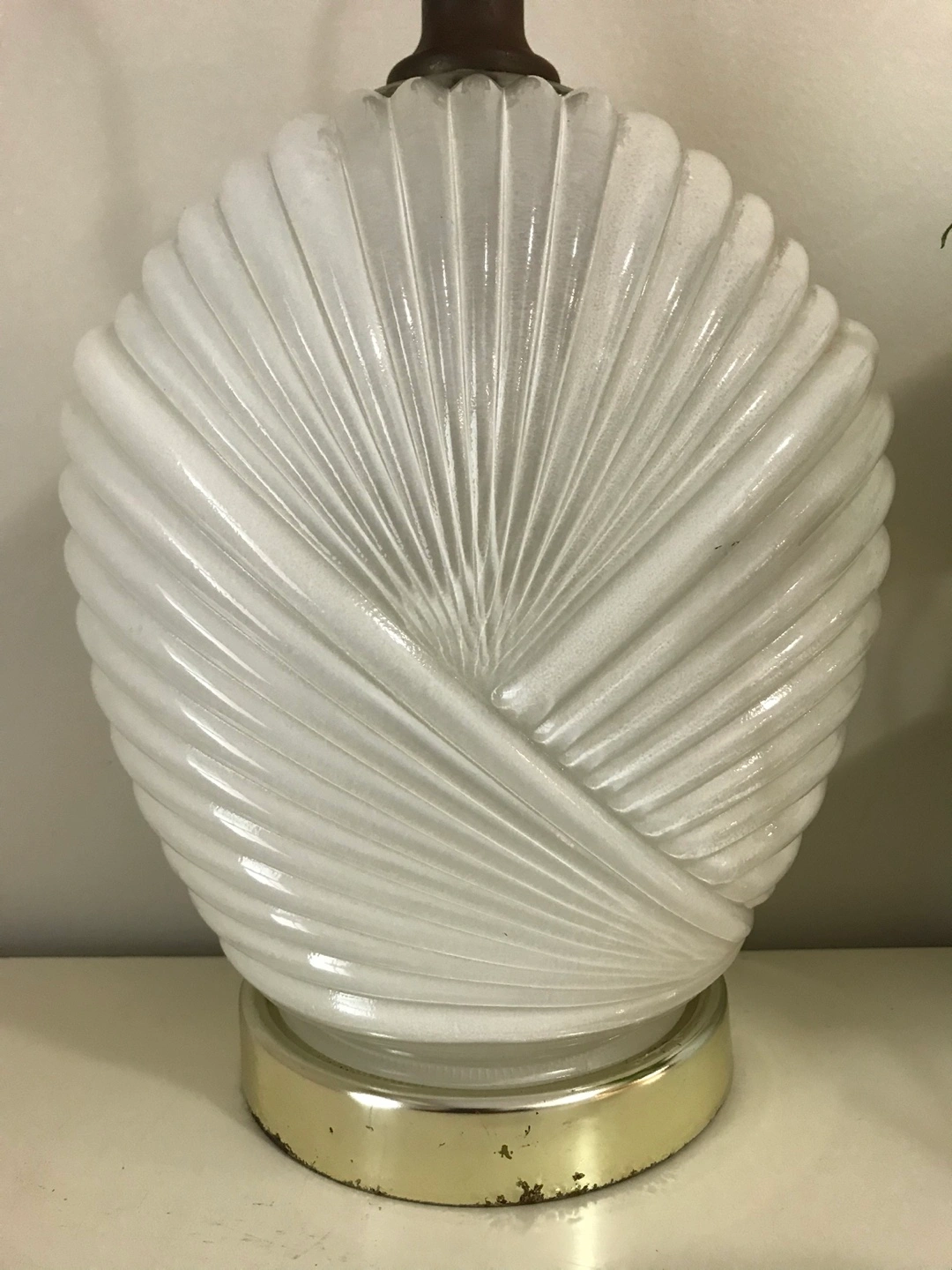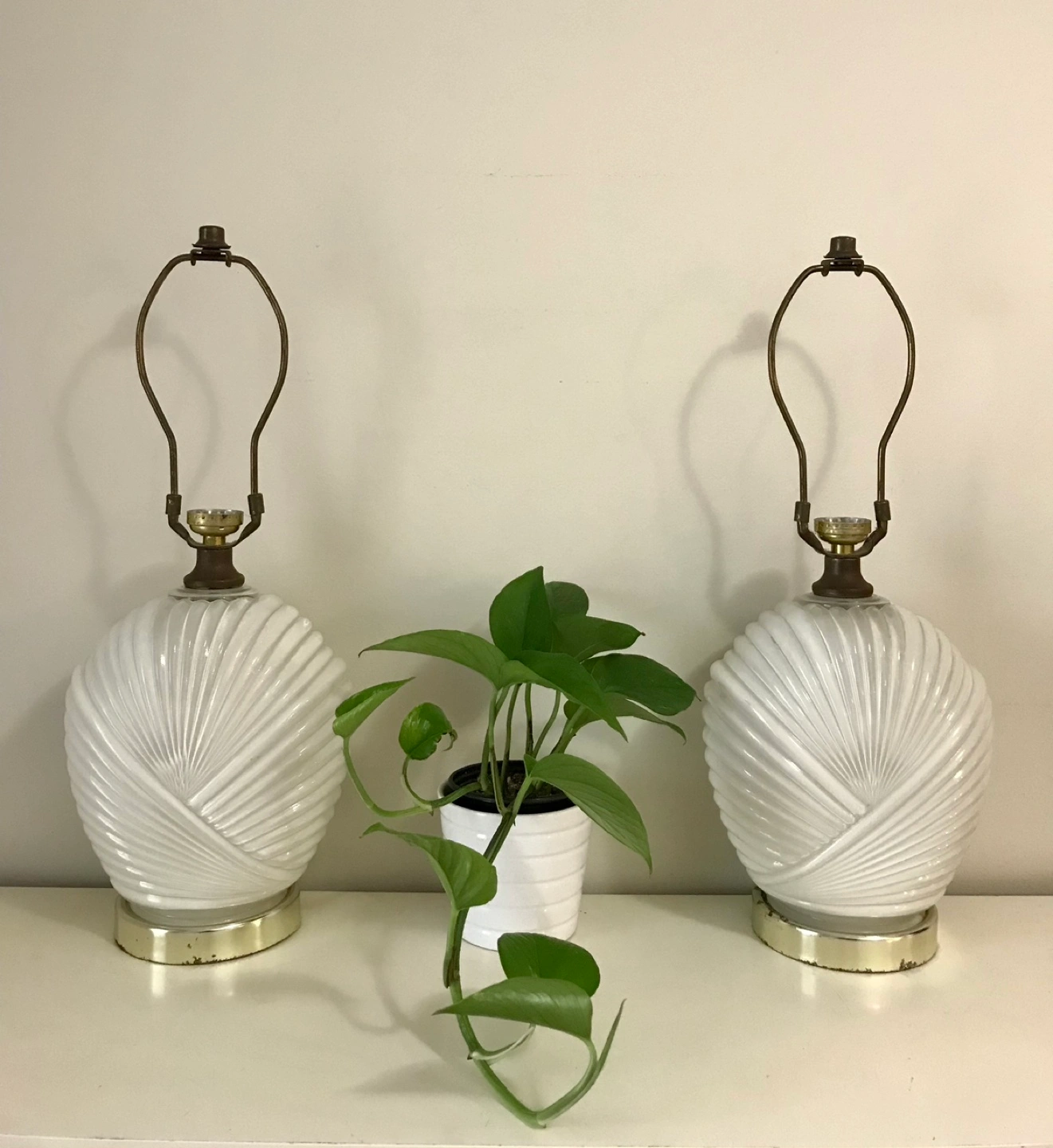 Pair of white glass lamps. Unique design with a ribbed glass shade. The shades are shaped like seashells. Sold as a pair. No bulbs included. Needs electrical wiring