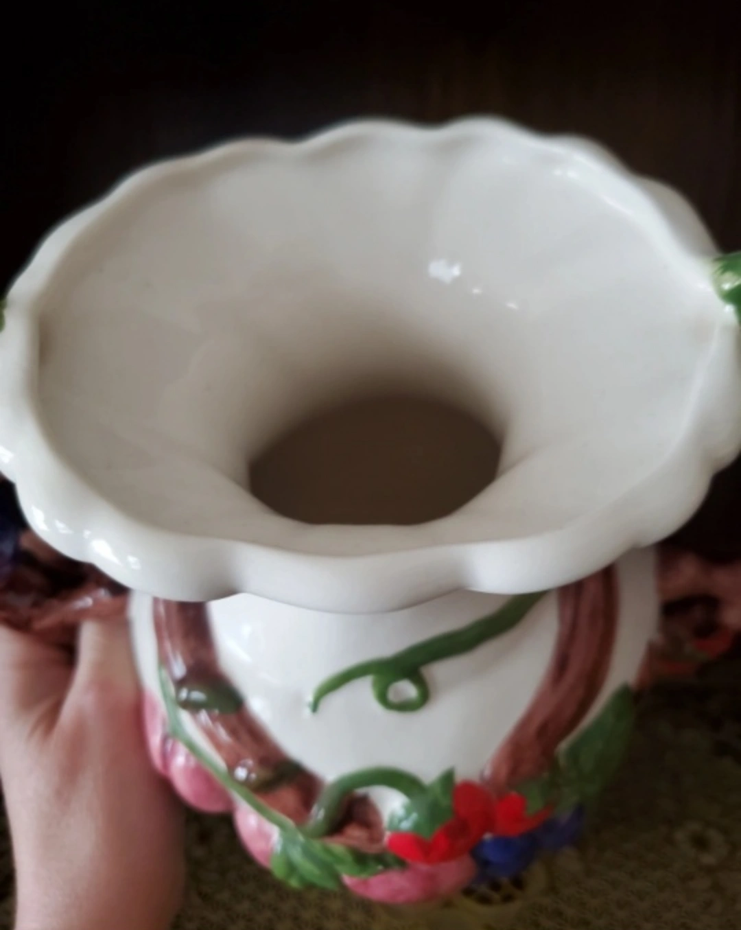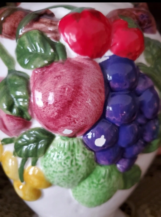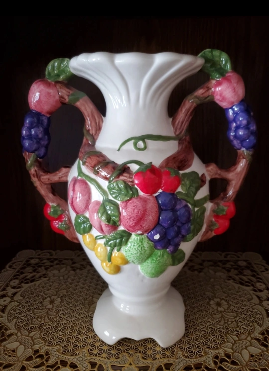 Beautiful hand-painted vase from the 1970s. It measures 12 inches tall, and has a lovely fruit pattern on the front and on the handles. It has a hairline crack on one of the handles, and a couple noticeable chips on the front.