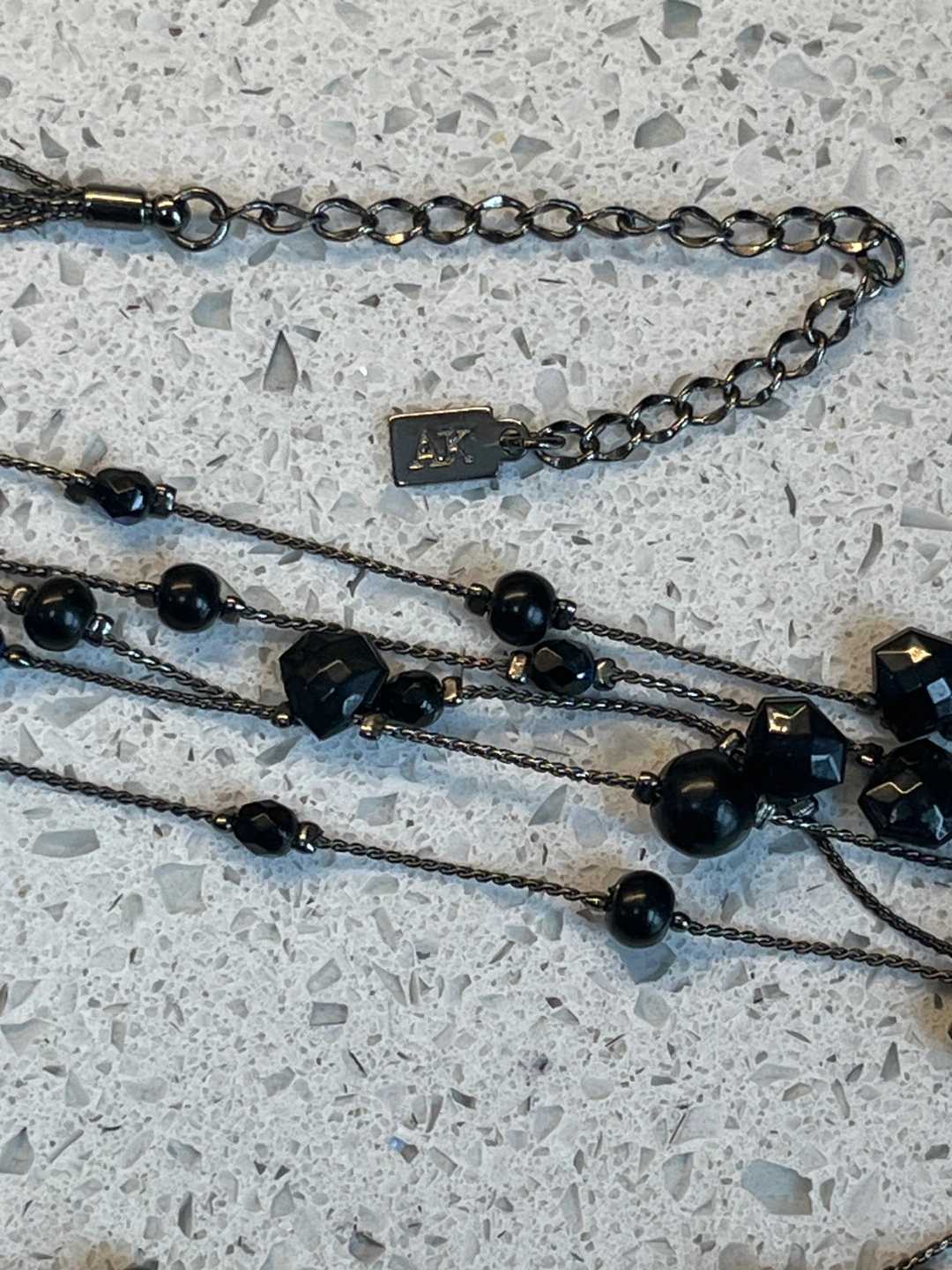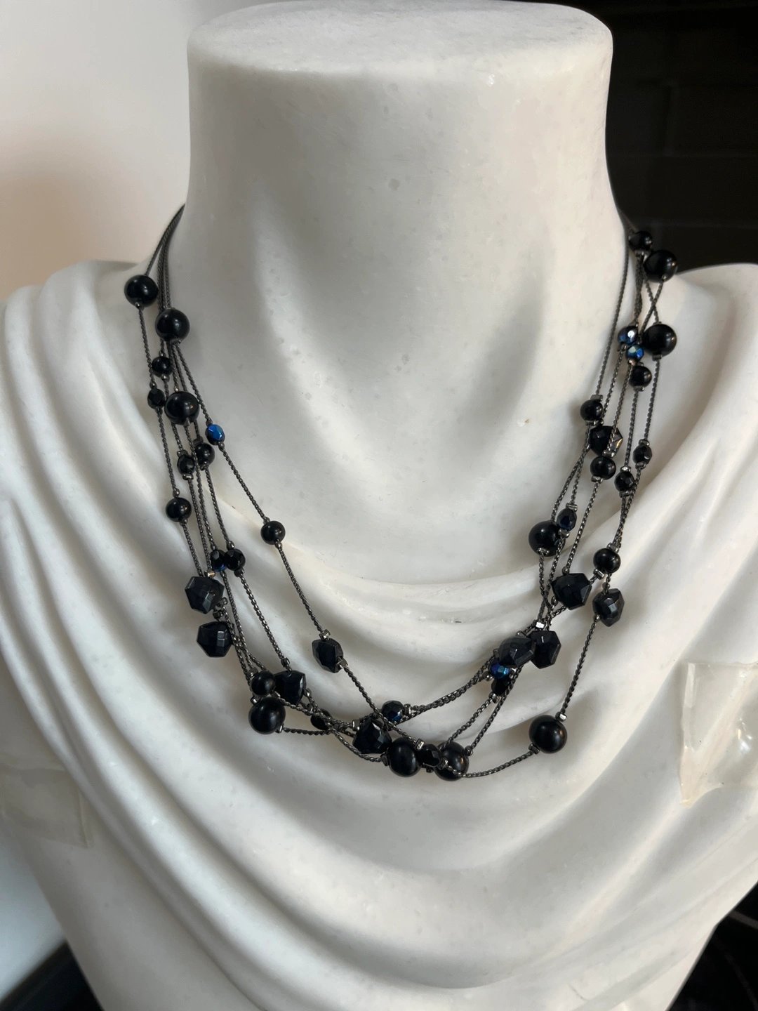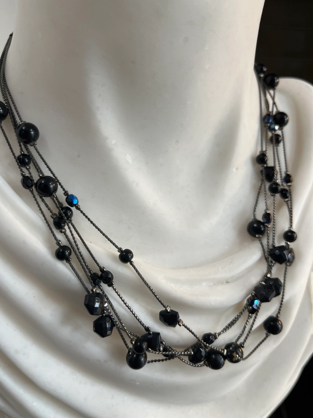 Multi-strand necklace featuring black beads and a black chain. The necklace has a lobster clasp closure.