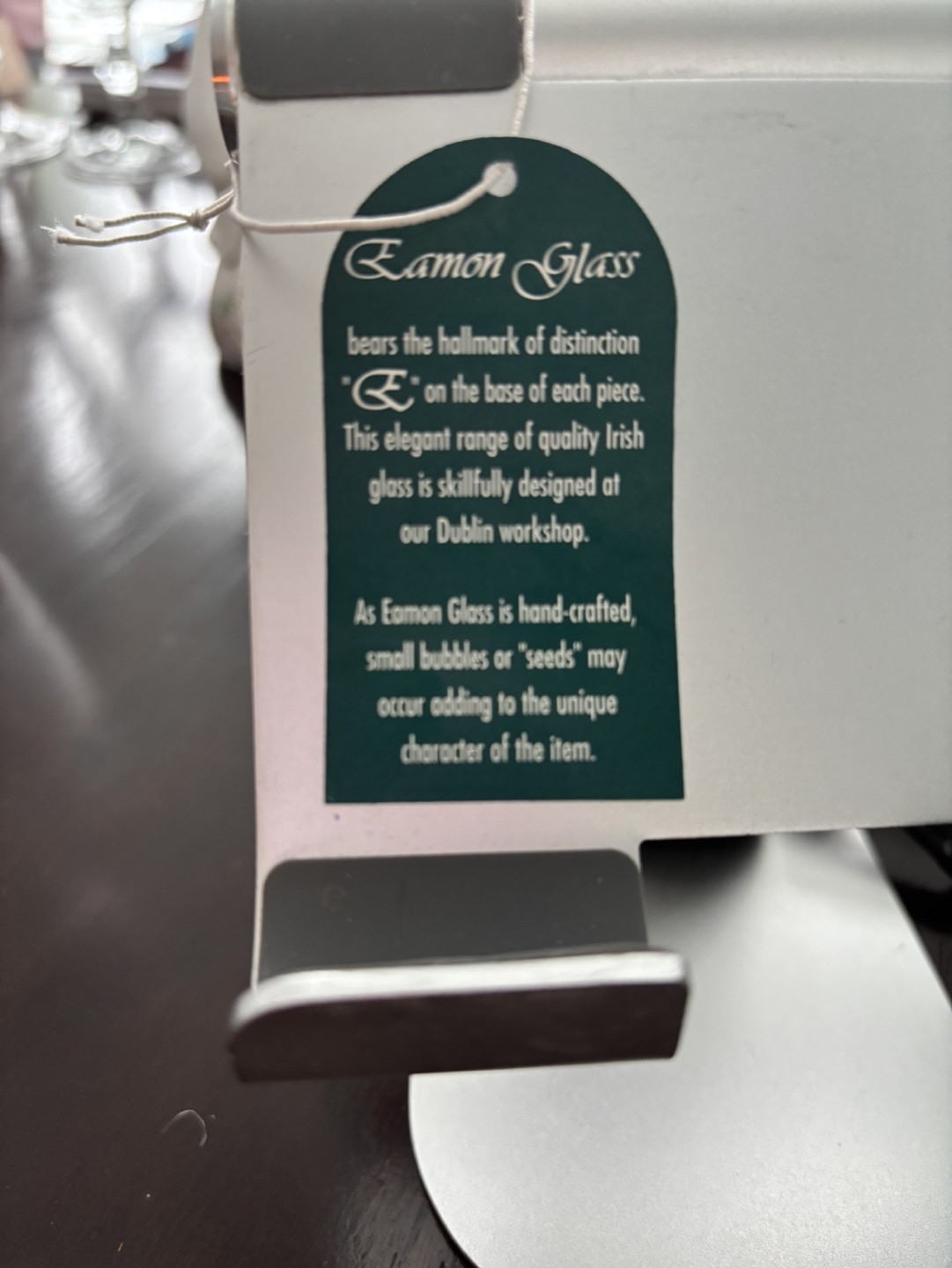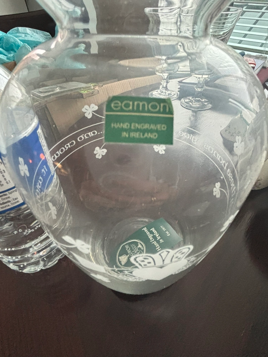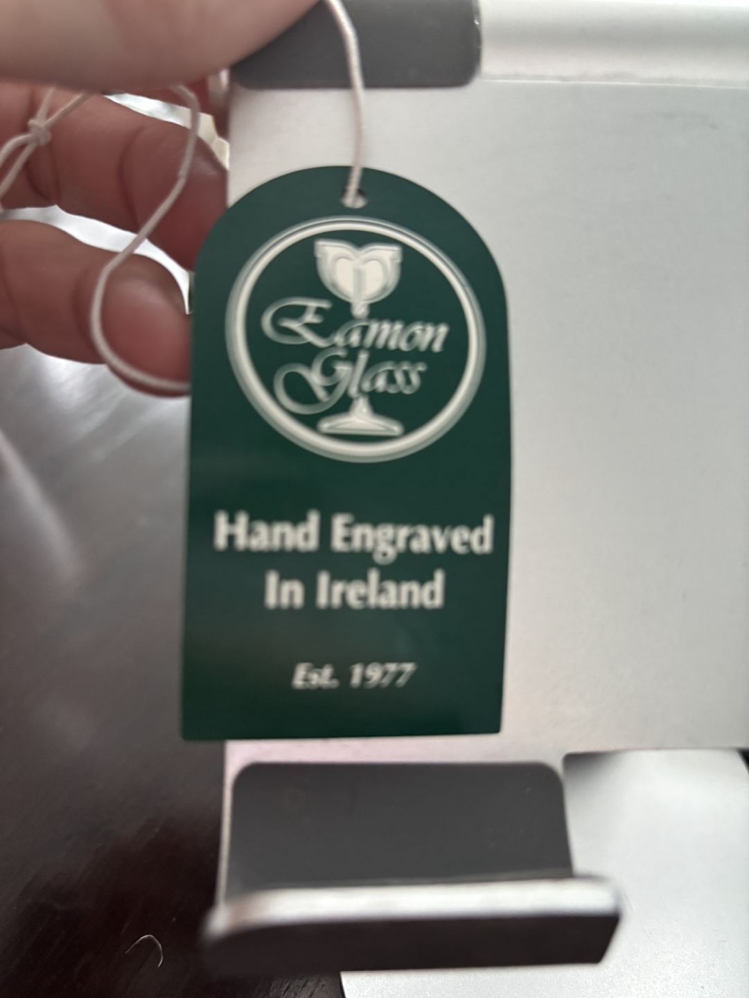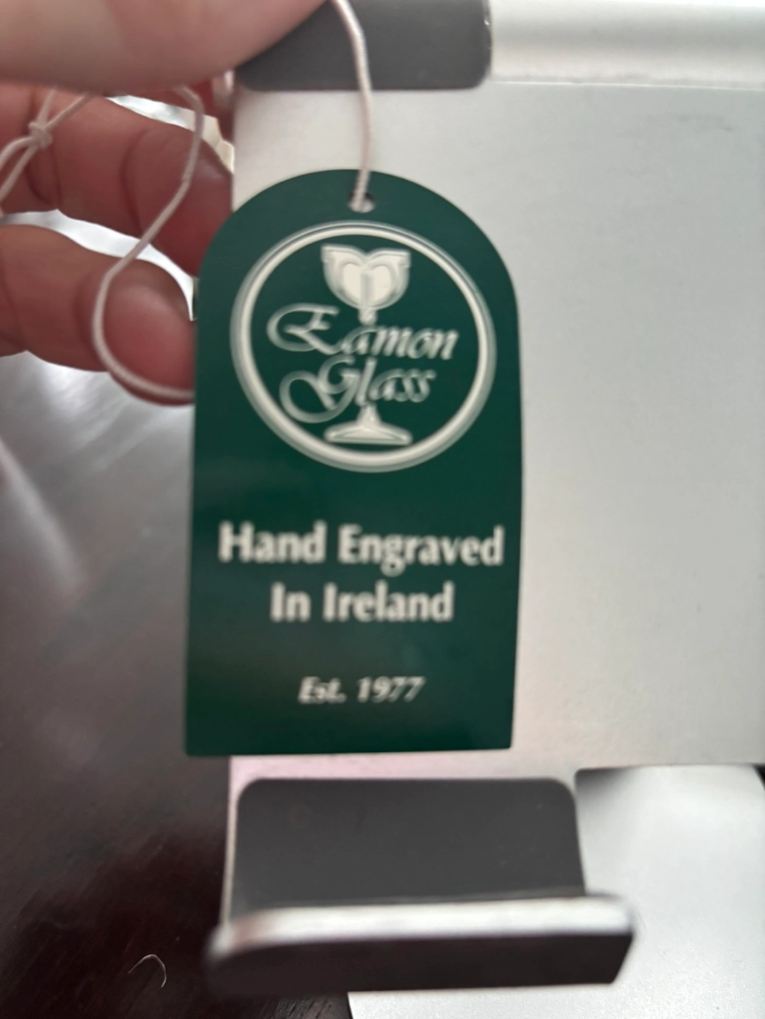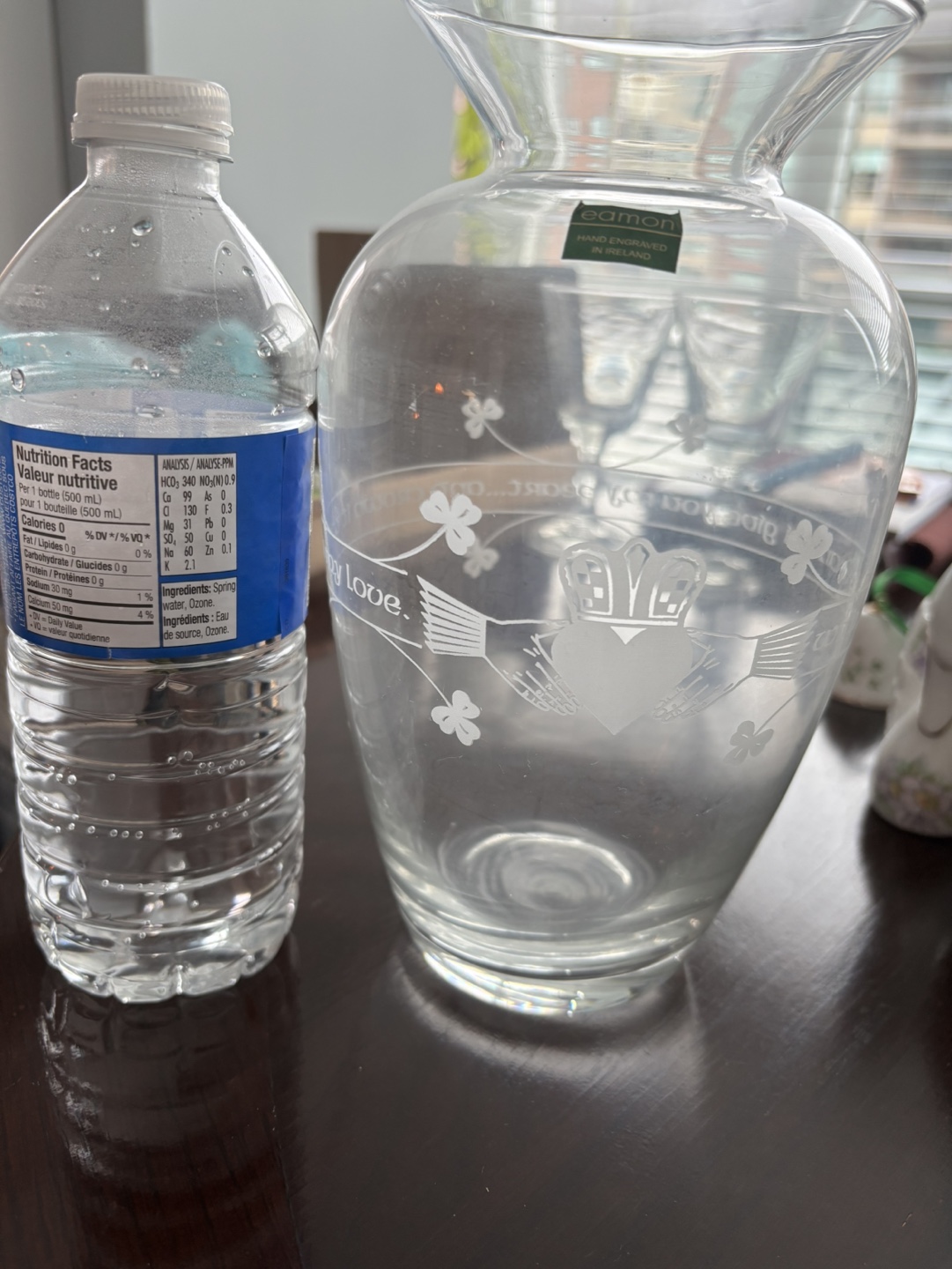 Hand engraved glass vase with a Celtic design. Made in Ireland. EST. 1977 Hand engraved with two hands holding heart crown. And engraved words, The Claddagh