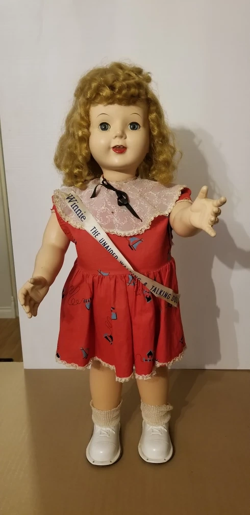 this is Winnie the walking doll from 1956 , ( that makes her 68 years old . ) . in very good condition , wind her up and she walks , moves her arms and head , voice not working . 24 inches tall . From the Advance Doll and Toy Co . Cash payment preferred . Thanks for looking .
