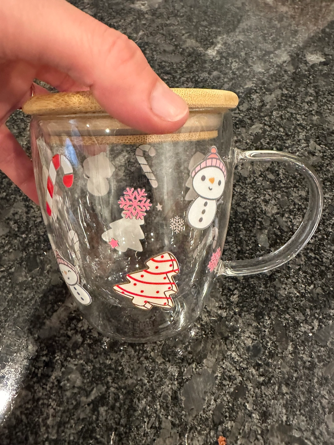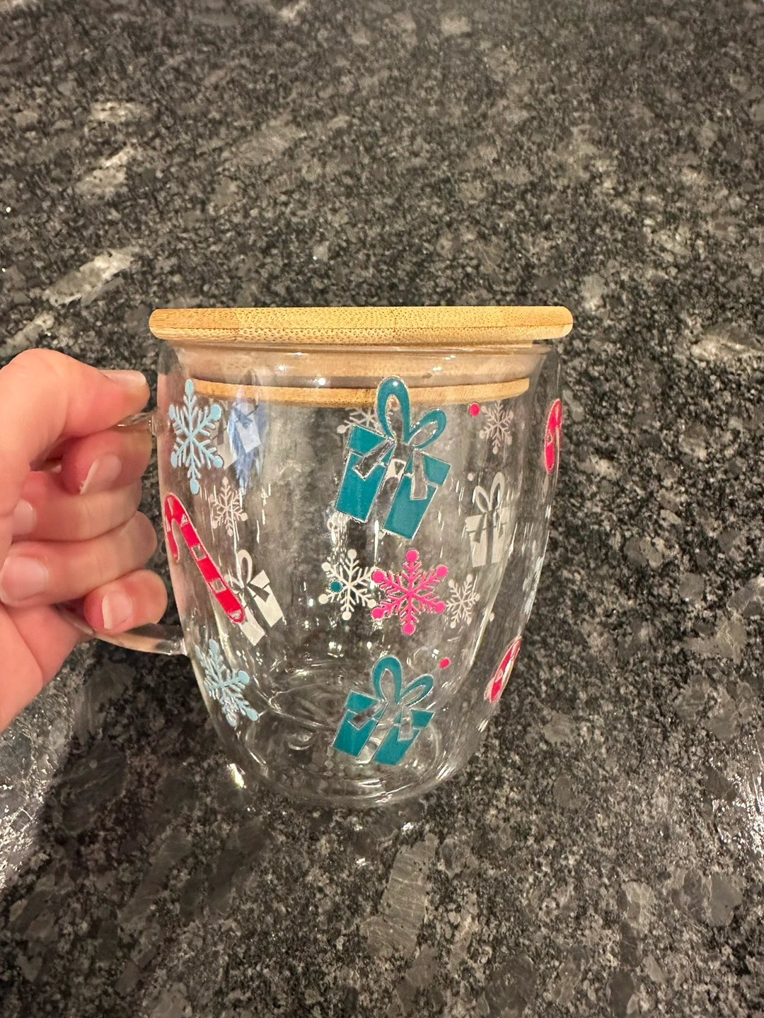 Hand made Double wall glass mug with a bamboo lid to keep you drinks hot or cold. Perfect Christmas gift!