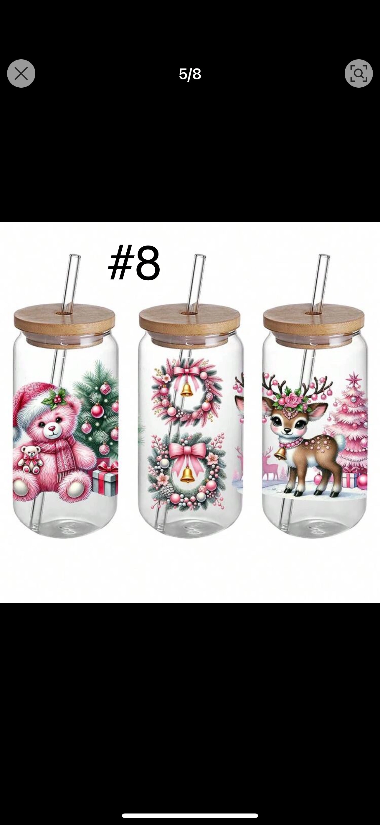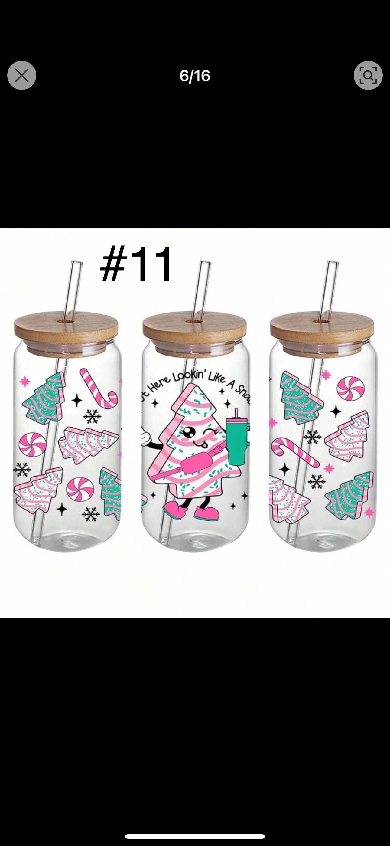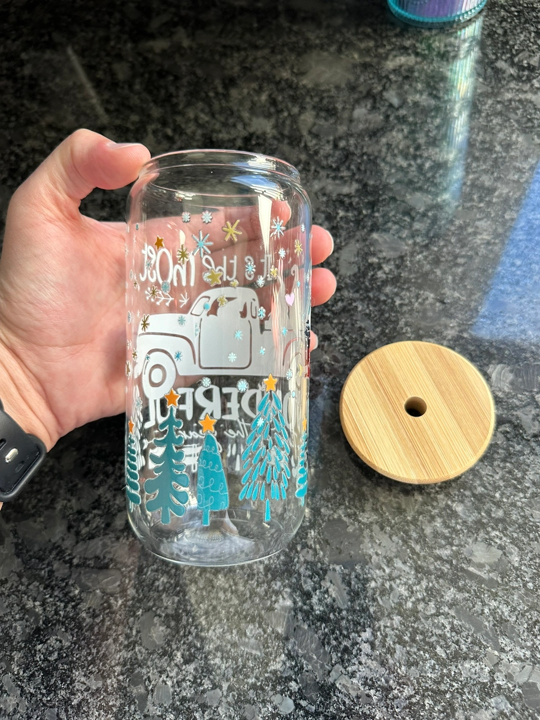 Hand made Christmas themed glass tumblers. Each cup includes a straw, a bamboo lid and a brush for the straw.