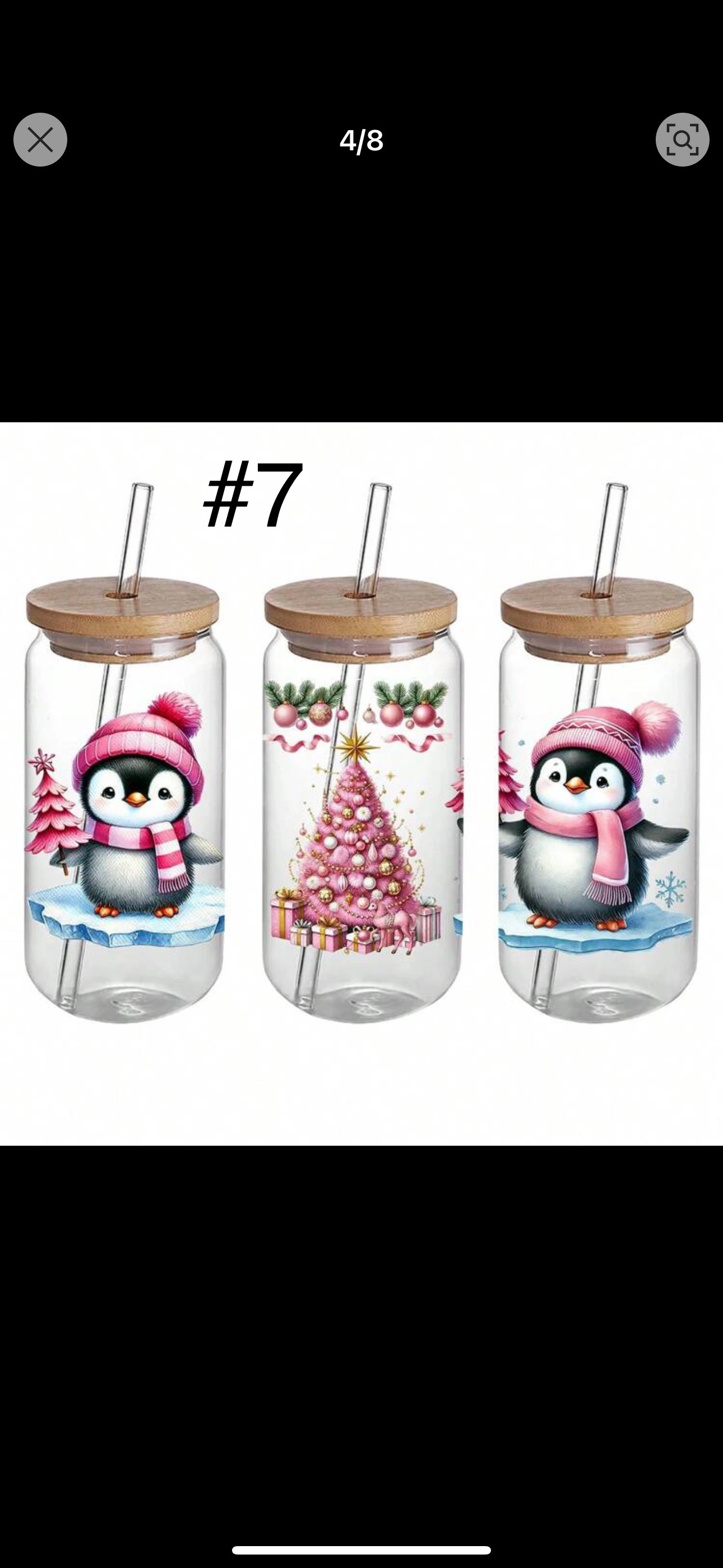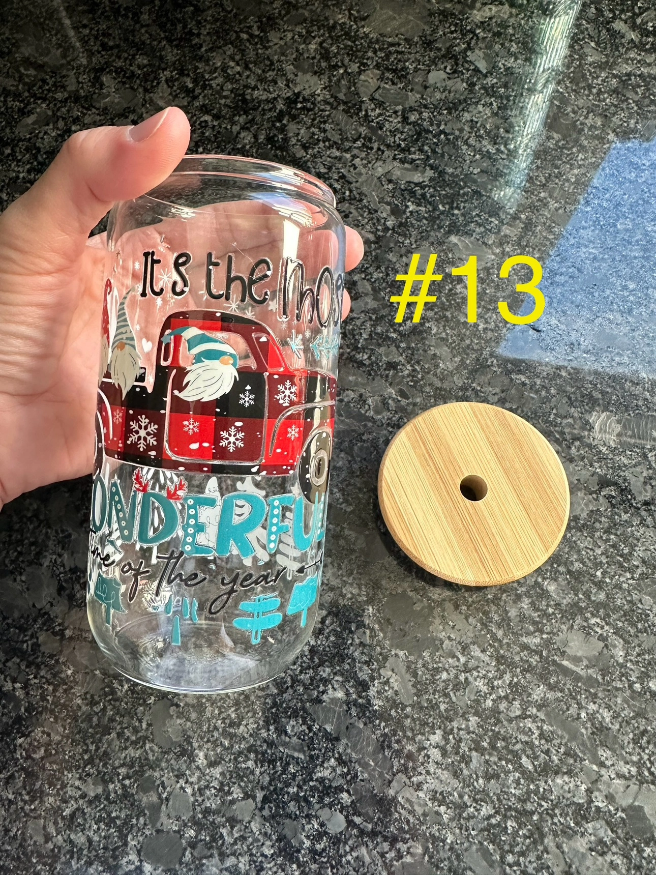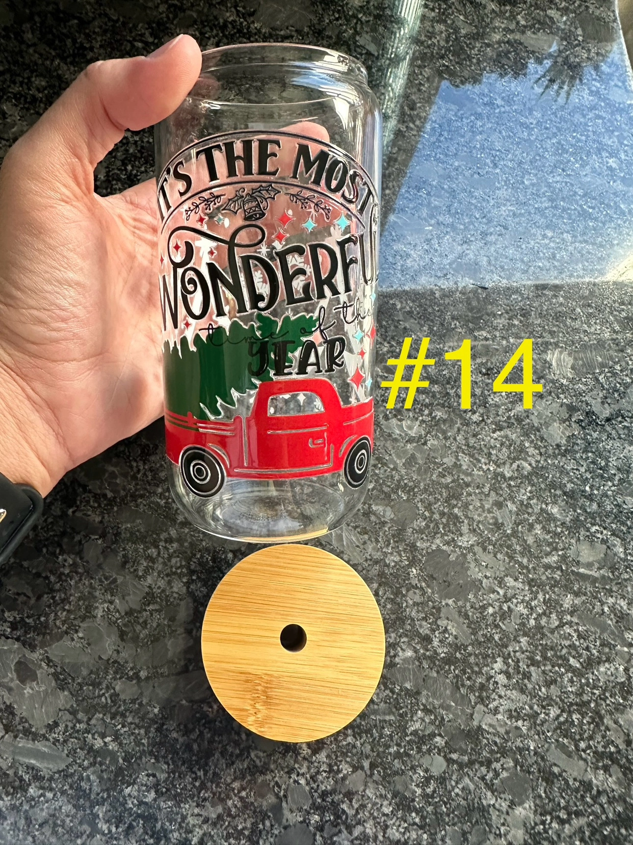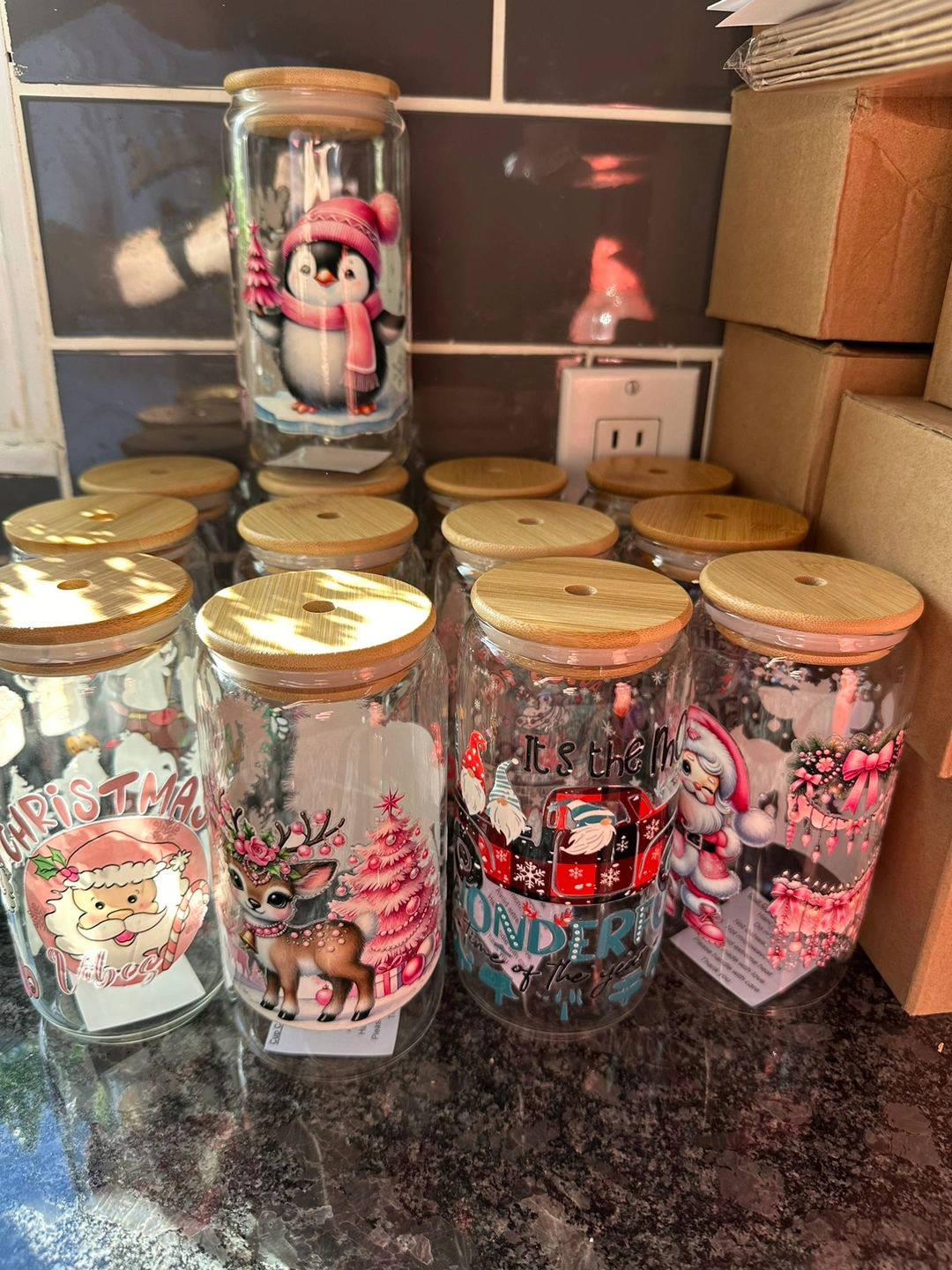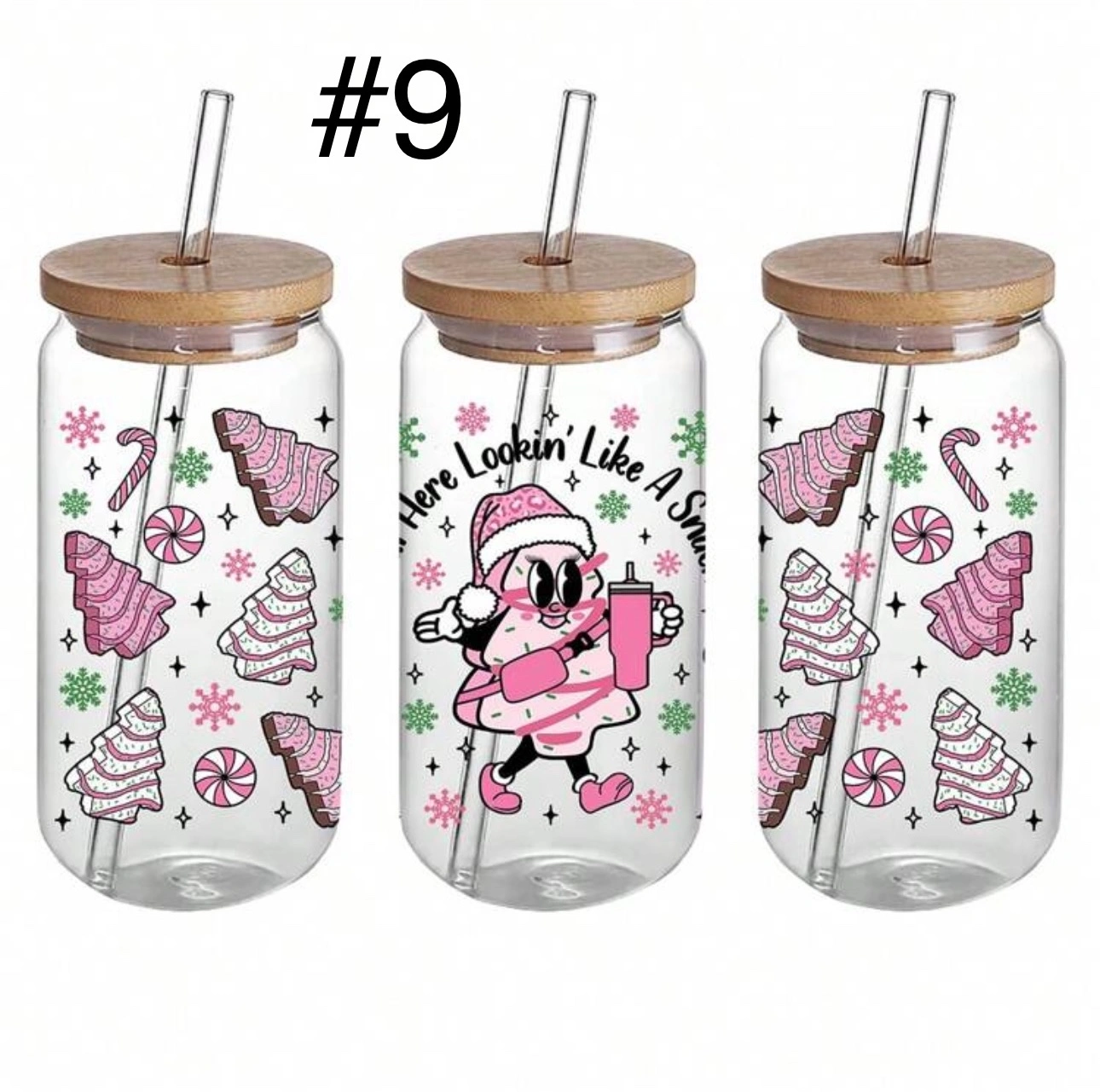 Christmas Themed Glass Tumblers with Straw and Bamboo Lid