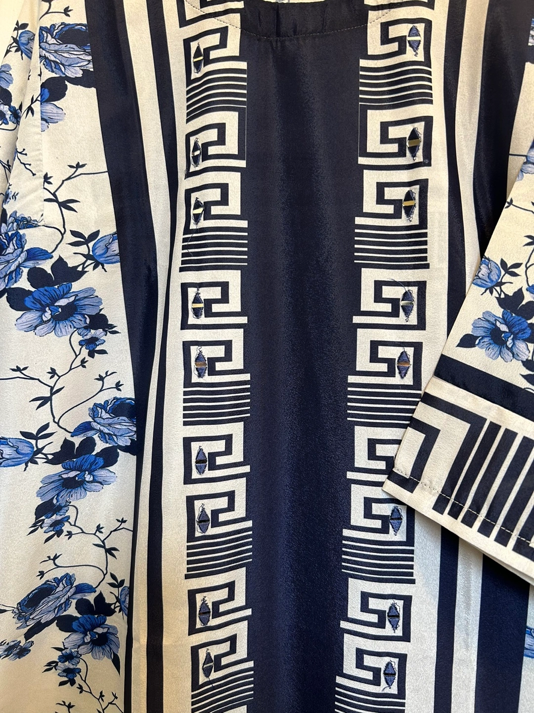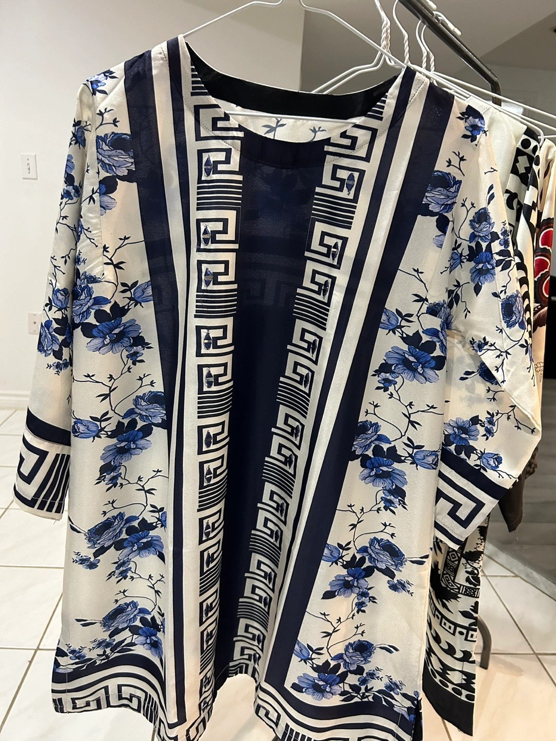 111White and blue floral printed top with a matching dupatta. Features a geometric pattern on the sleeves and trim. Three-quarter sleeves.
