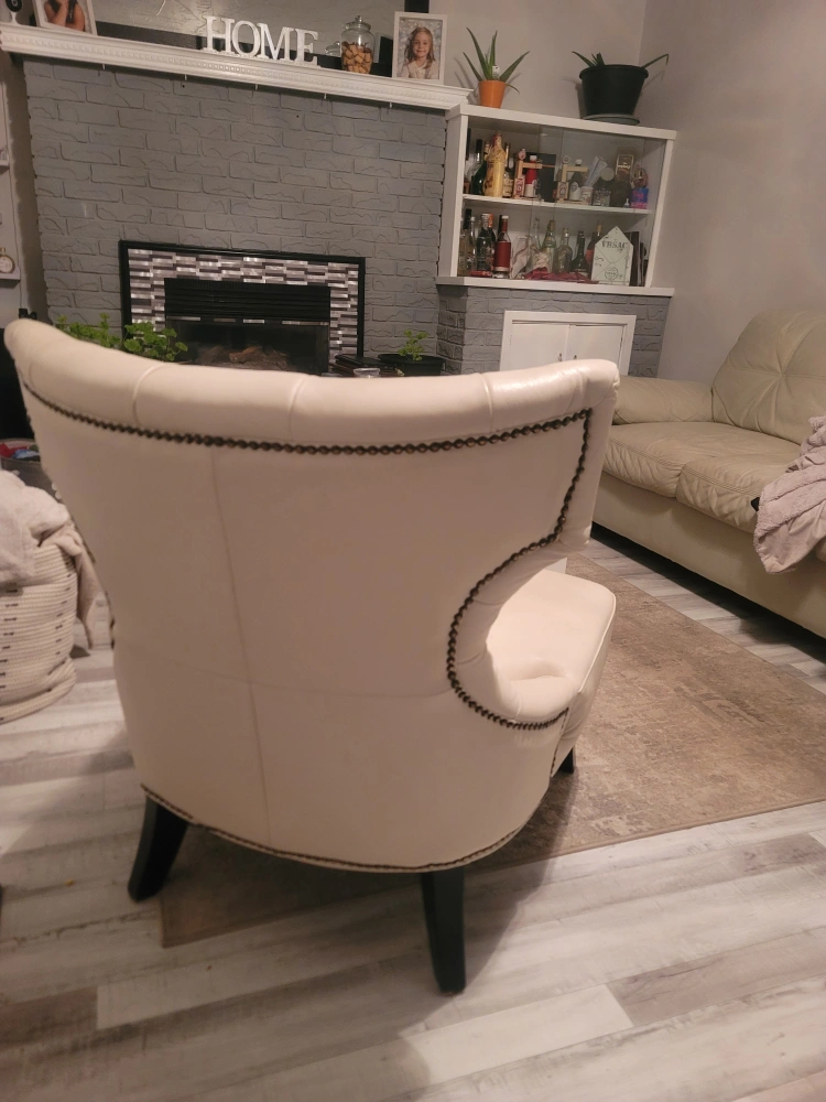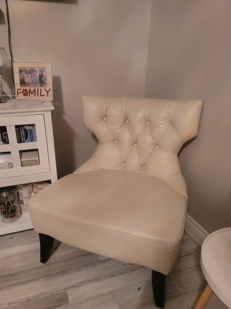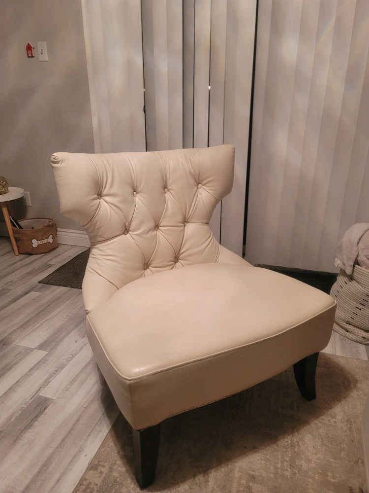 Beige leather accent chair with black legs. Tufted back and sides. In excellent condition.