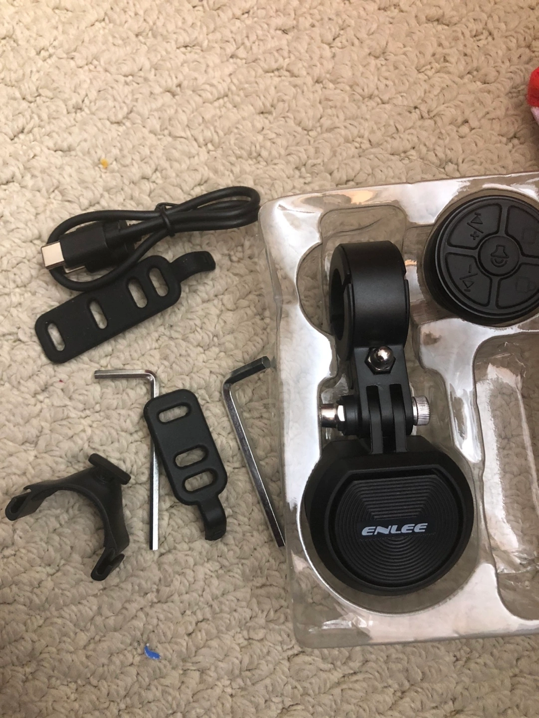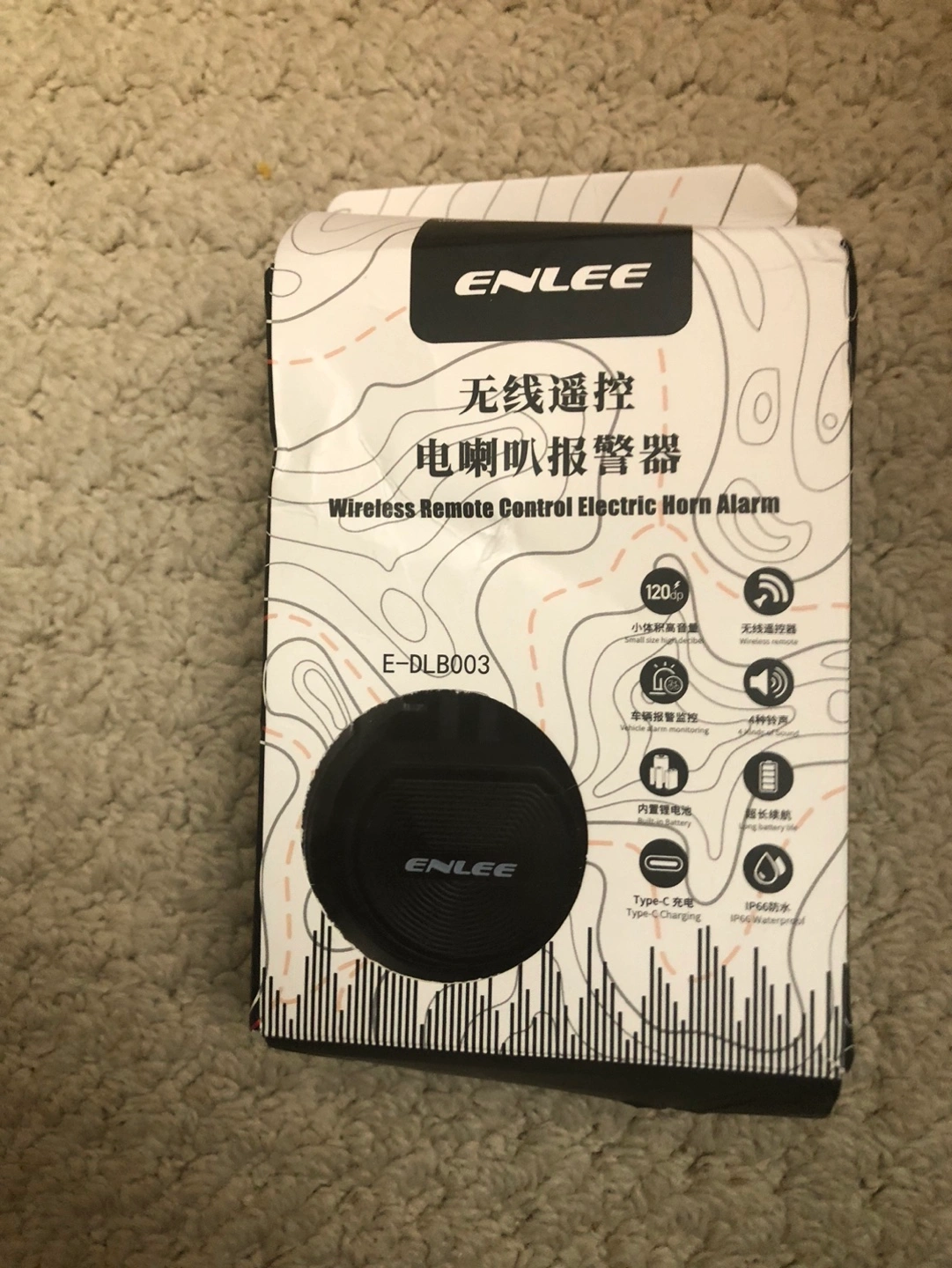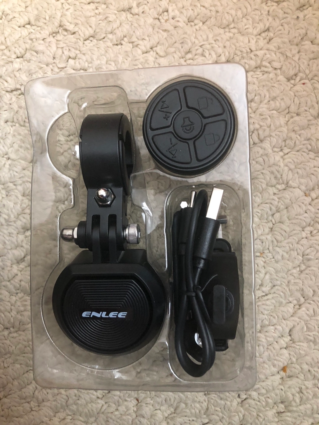Electric horn for bicycle. Wireless remote control electric horn alarm, includes charging cable, mount, remote, and tools.