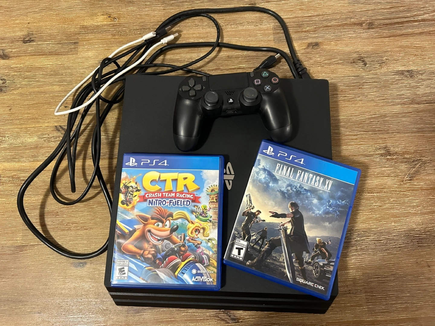 PS4 Pro console, one controller, power cord, HDMI, USB to recharge controller. Crash Team Racing Nitro-Fueled, and Final Fantasy XV.