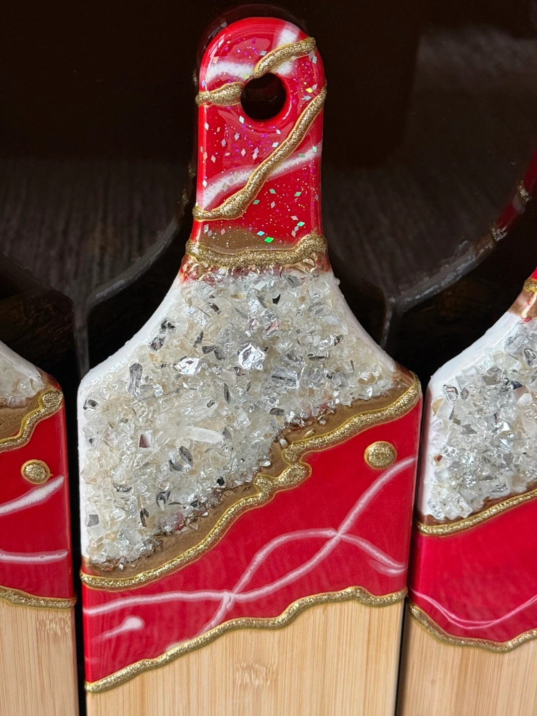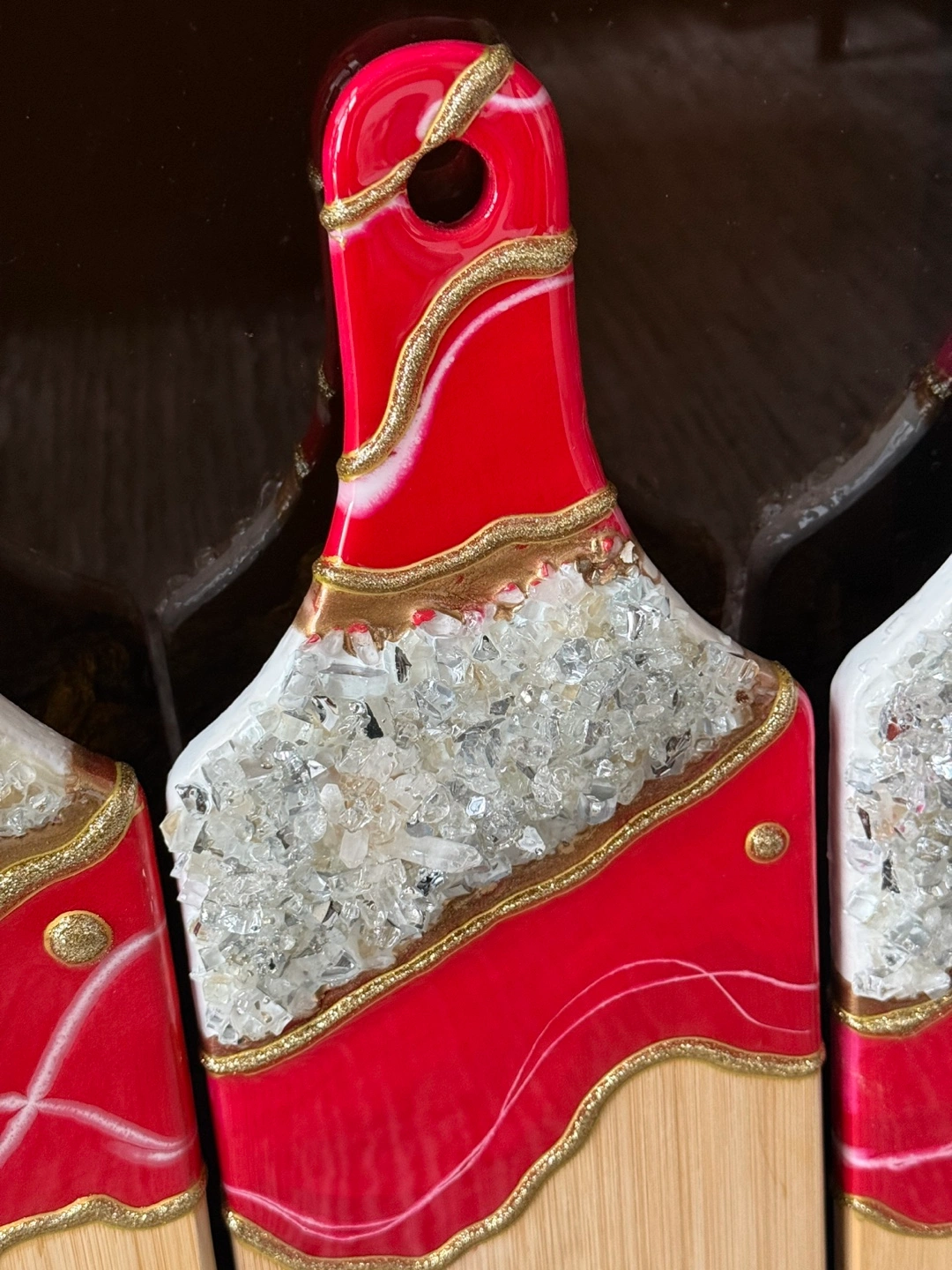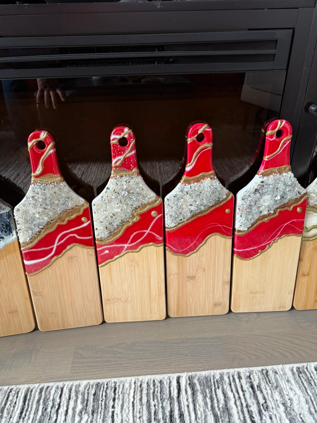 25Handmade serving board made from bamboo with red and gold epoxy resin and embedded crystals. Features a comfortable handle. Any questions please you can contact me They are unique Perfect Xmas gift Food save