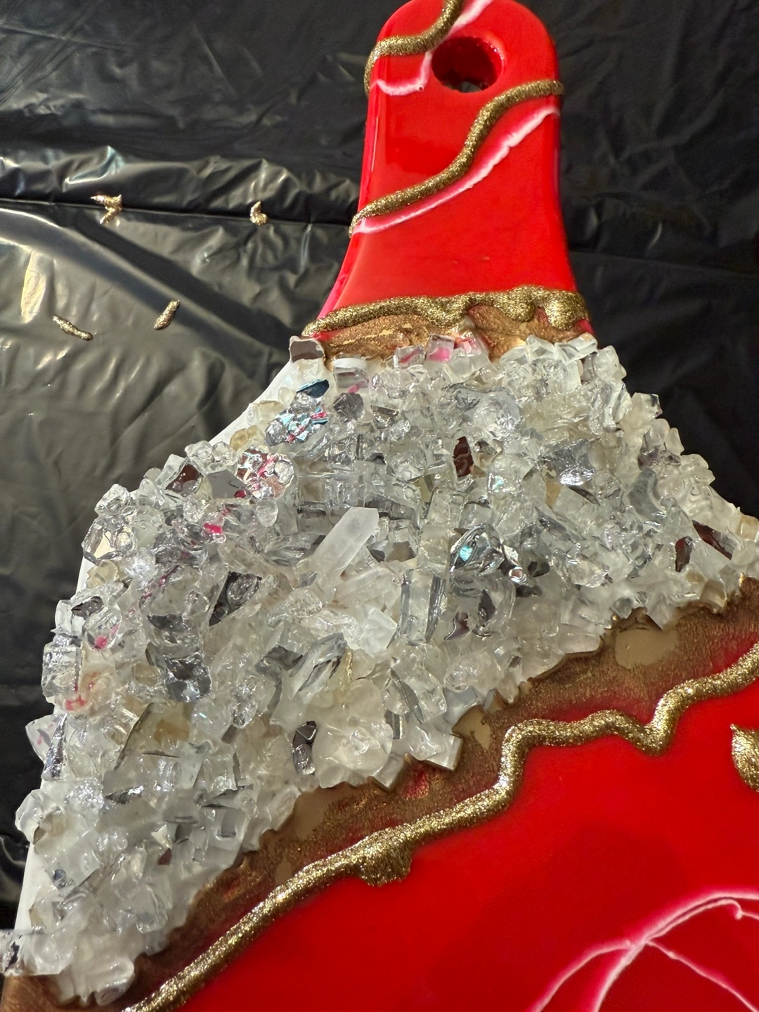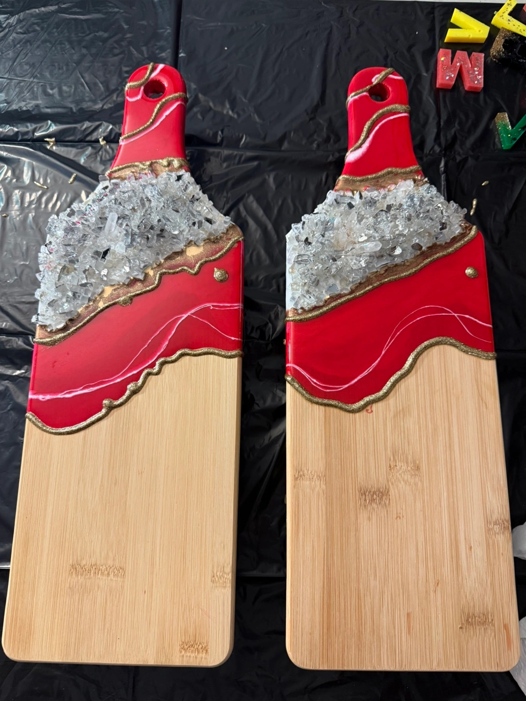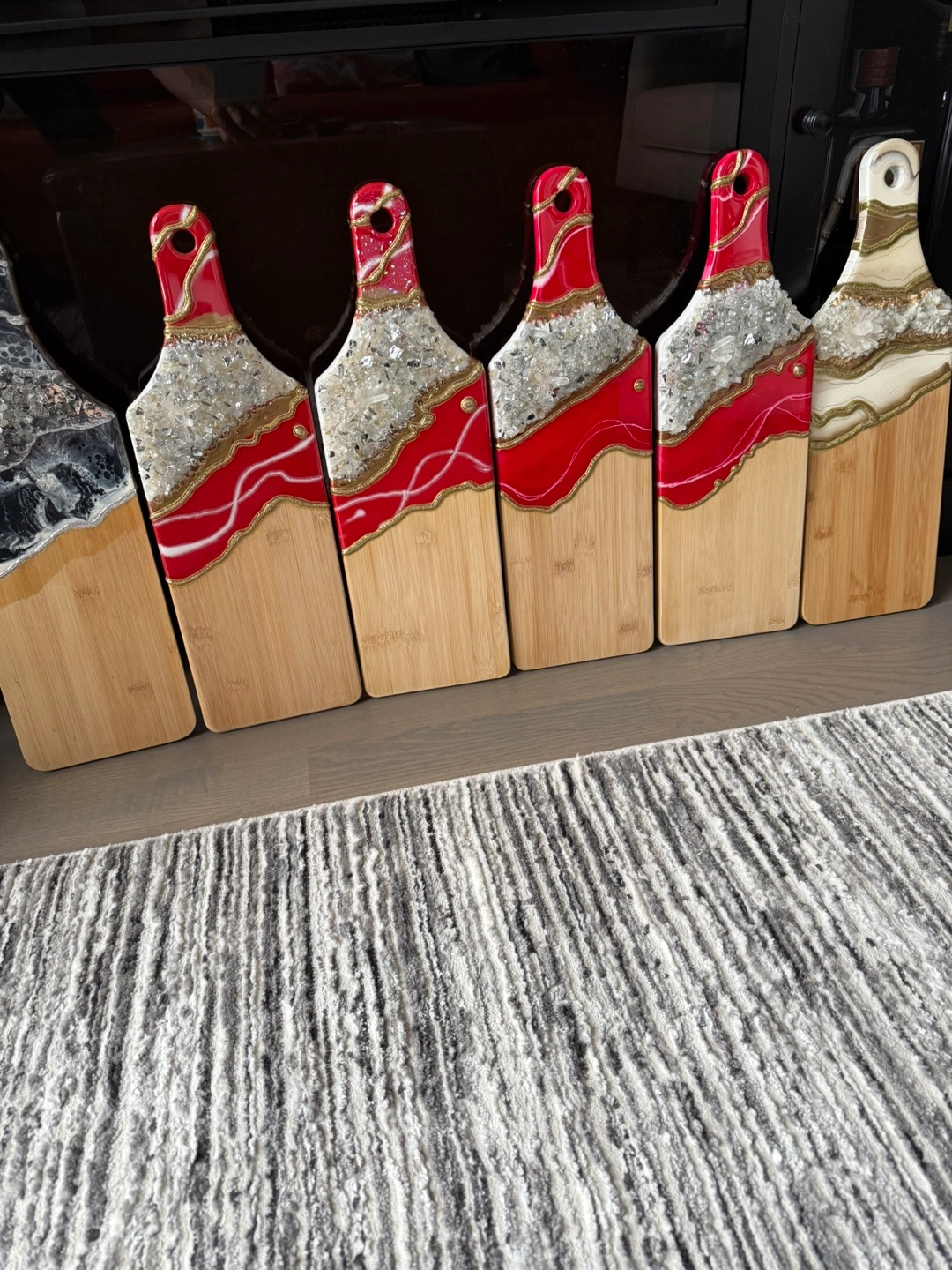 25Handmade serving board made from bamboo with red and gold epoxy resin and embedded crystals. Features a comfortable handle. Any questions please you can contact me They are unique Perfect Xmas gift Food save