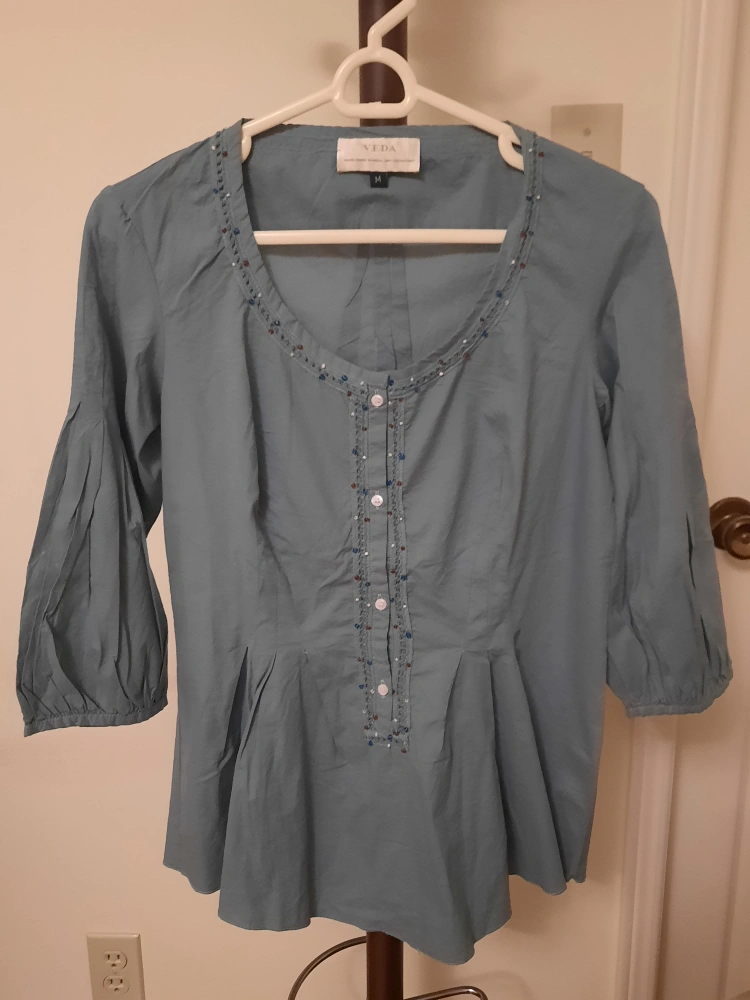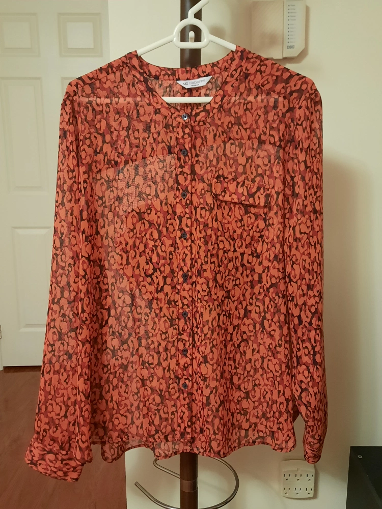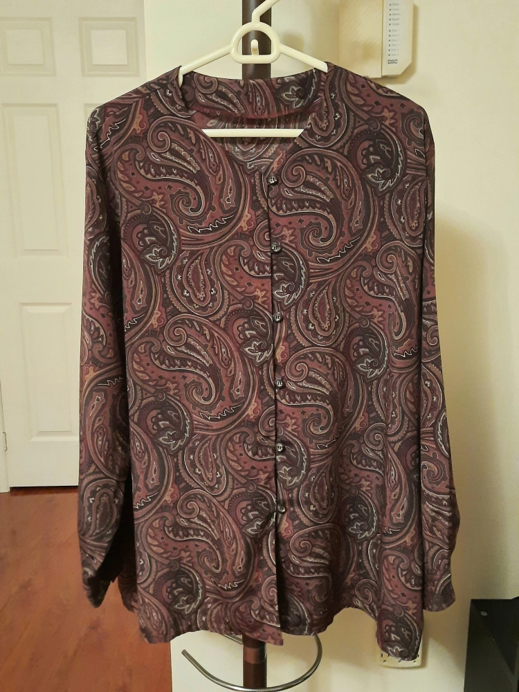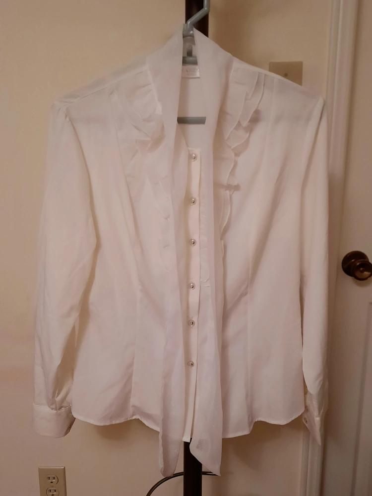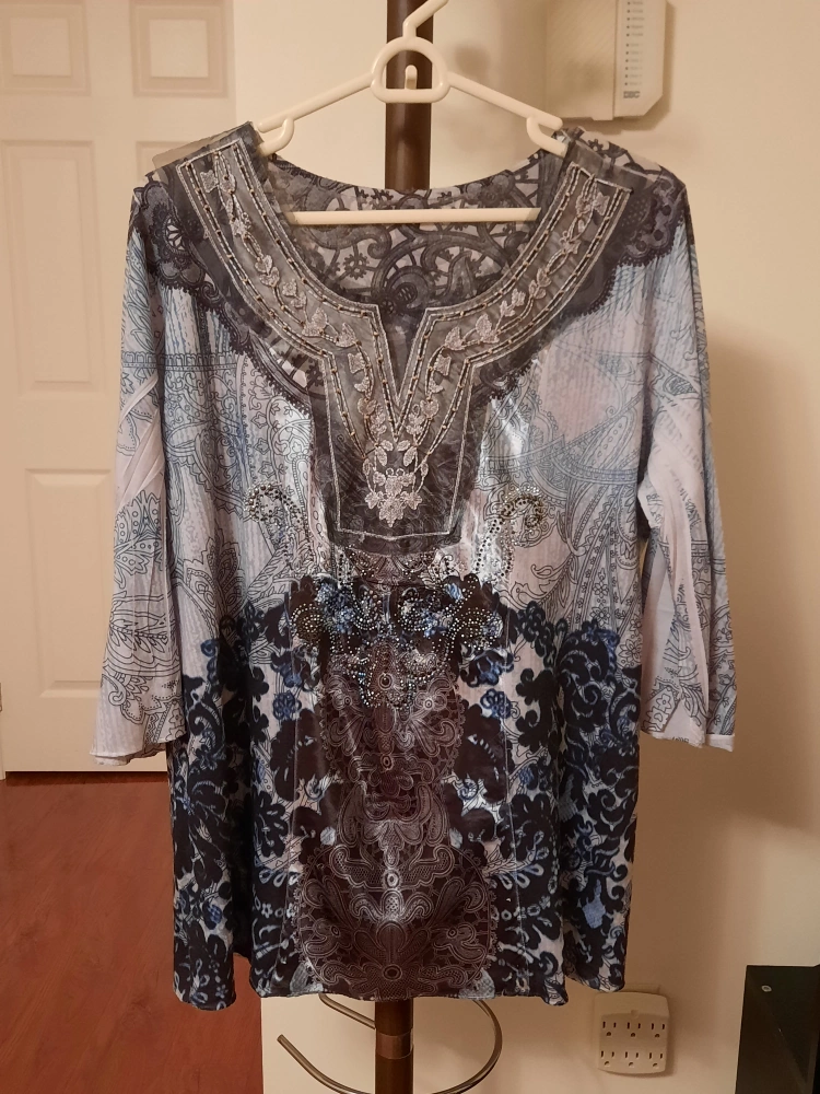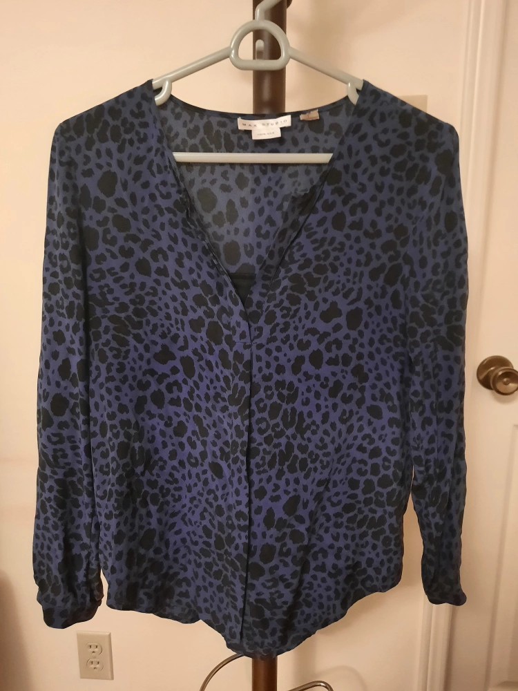 46New condition, some with tags removed. Prices range from $15 to $30. 1. Vtg Paisley printed blouse - tags removed, 3XL $30 2. Liz Claiborne semi sheer blouse- 2XL $30 3. New Directions embellished top- brand tag removed, 2XL $20 4. Shares ruffle front white blouse- XL $20 5. Veda 3/4 sleeve tunic top- M $15 6. Max Studio leopard printed top- XS $20