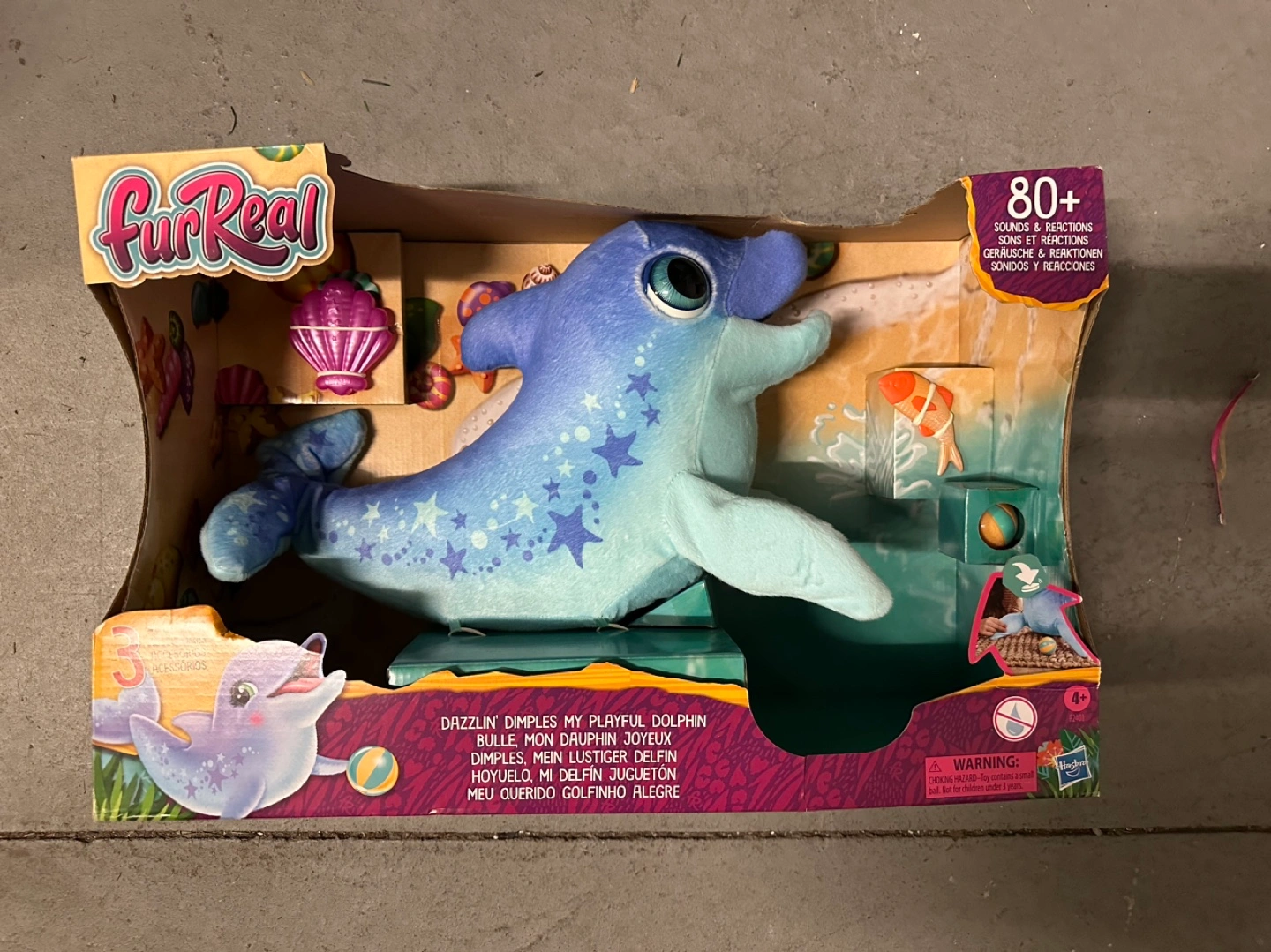 1000+Interactive plush toy dolphin with 80+ sounds and reactions. Includes a ball.