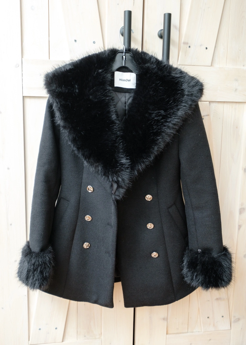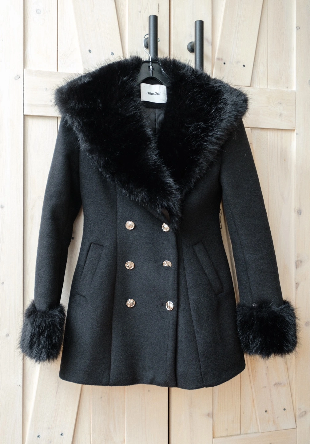 Black coat with faux fur collar and cuffs. Double breasted with gold buttons. Fully lined. Excellent condition, size small.