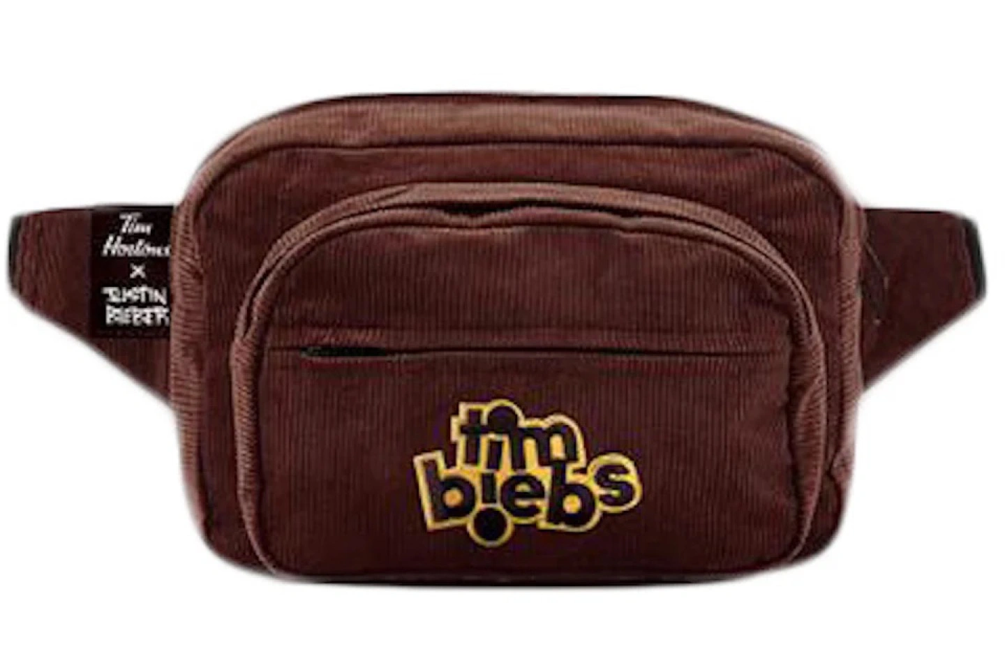 1000+Brown corduroy bum bag with Tim Hortons x Justin Bieber branding. Features a zippered pocket on the front.