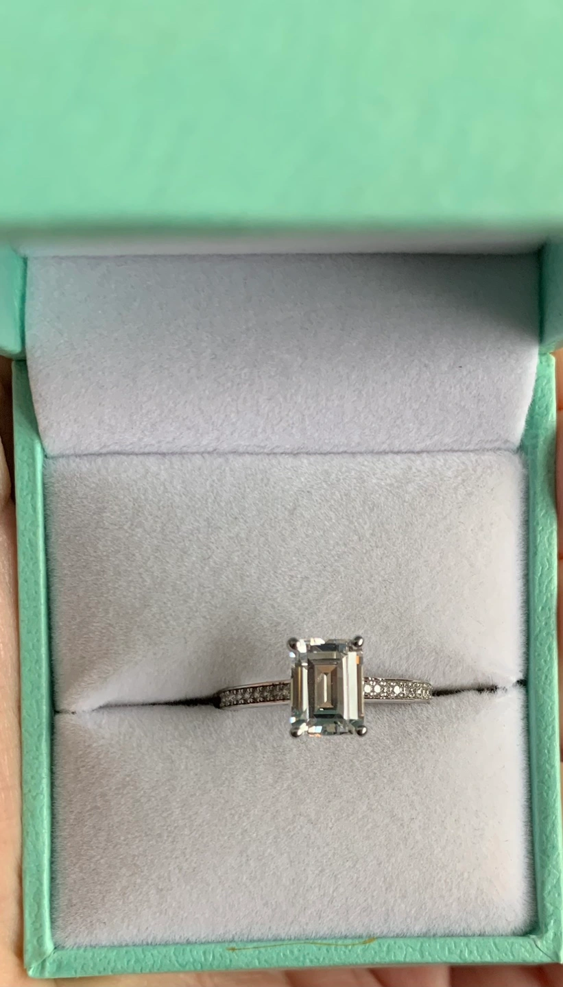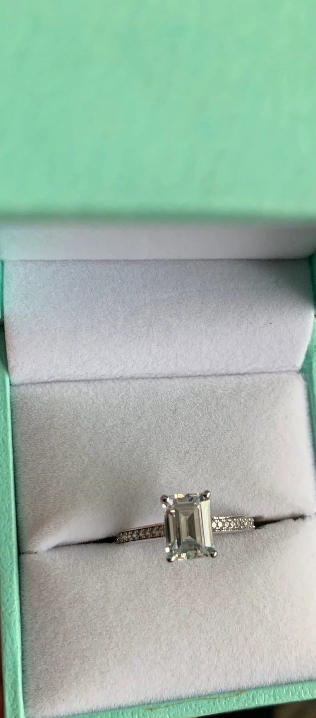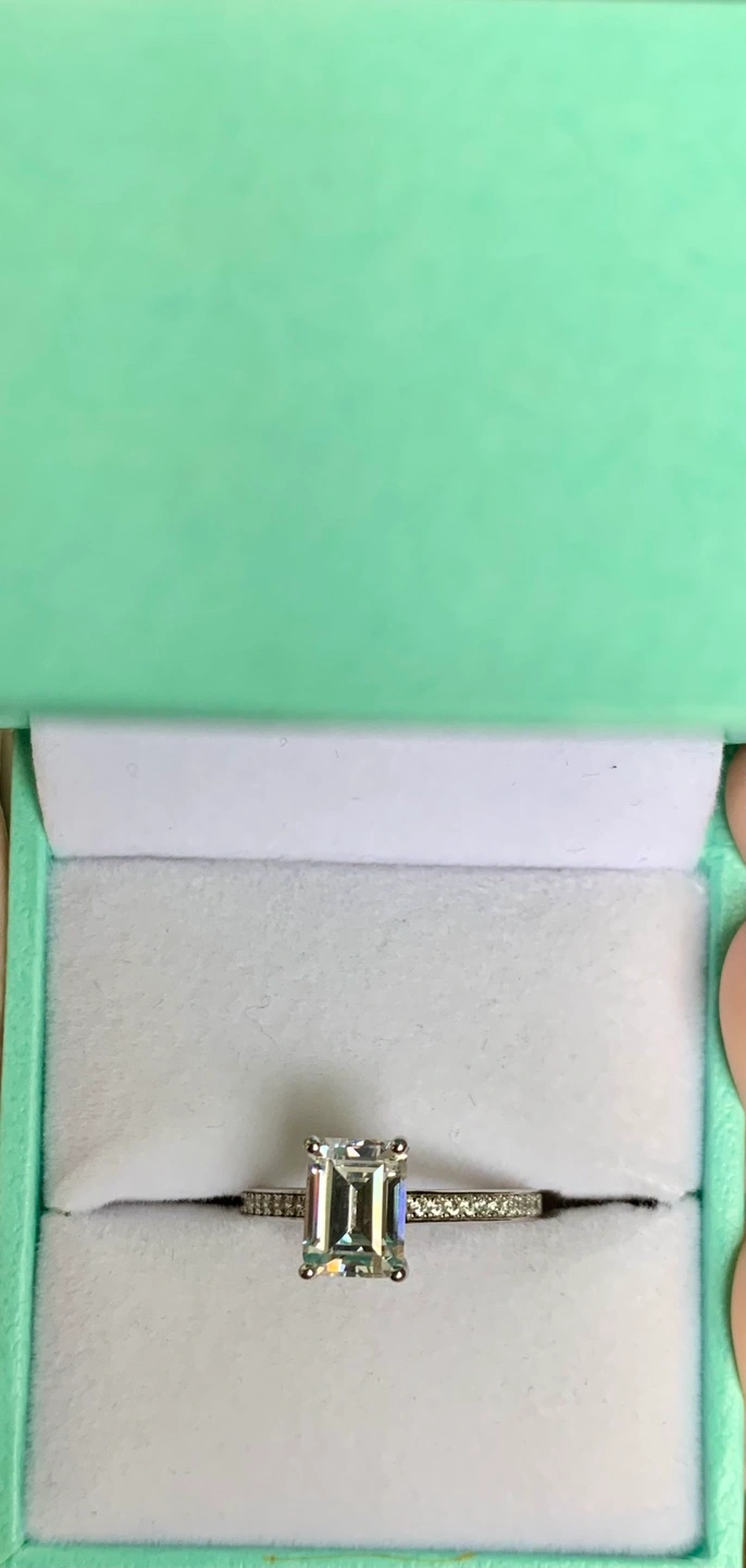 White Gold ring with a 1CT emerald cut centre stone and smaller stones along the band. Lab Simulated Diamond 925 Band.