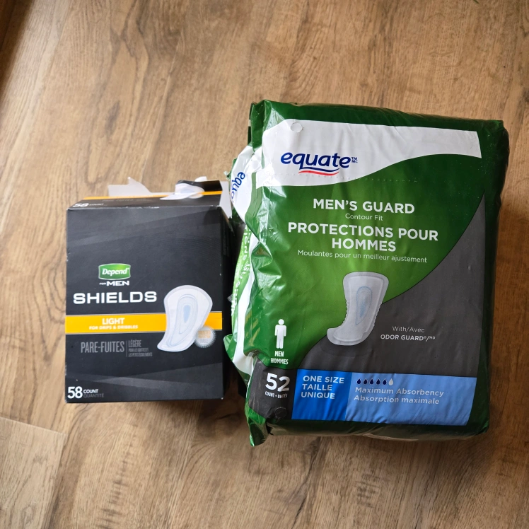 Two packages of incontinence products. One package is Depend Men Shields Light with 58 count. One package is Equate Men's Guard with 52 count.