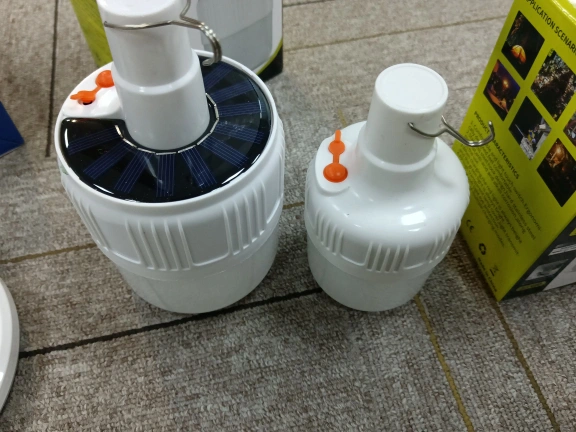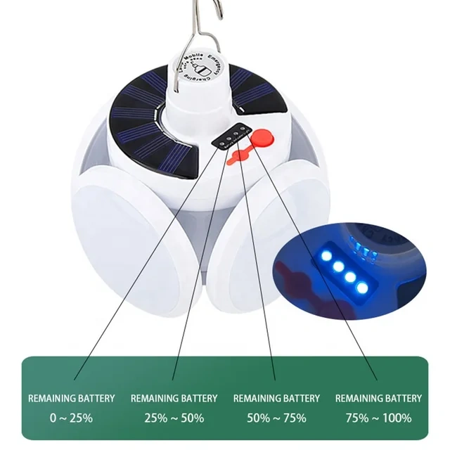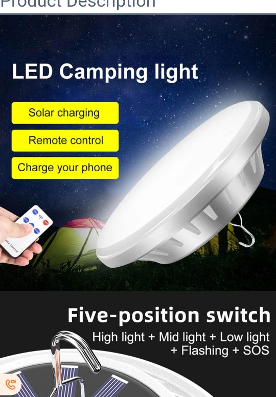 LED camping light with remote control. Features solar charging, five-position switch, and a charging port for your phone.