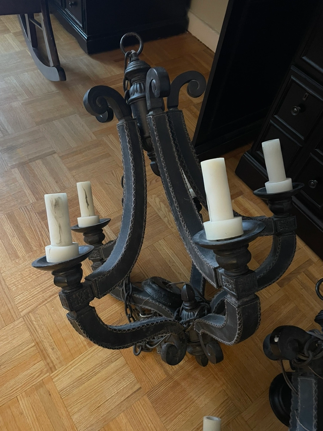 Candle-style chandeliers of solid wood and high-quality leather (if it’s vegan leather, it’s crafted to the highest standards).