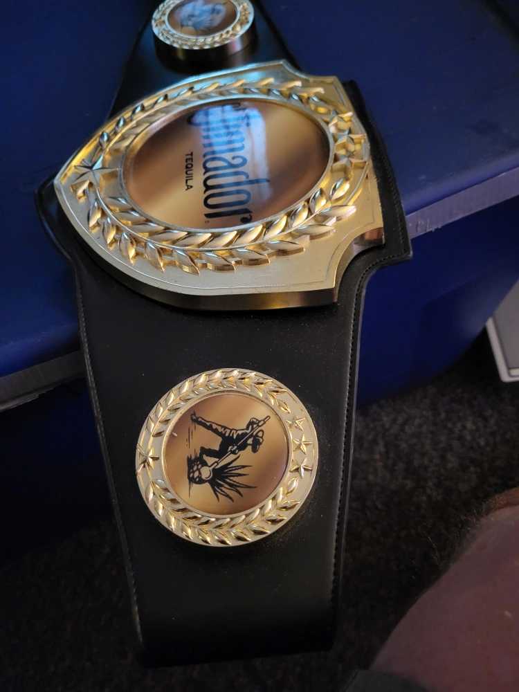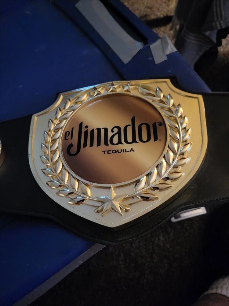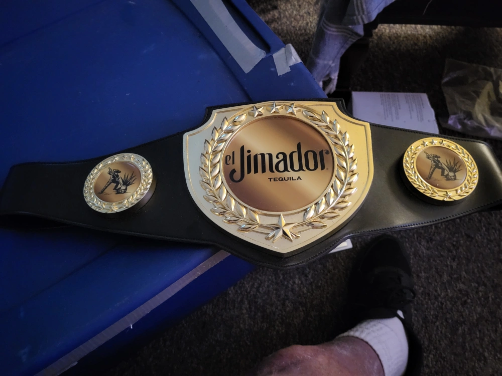 Black leather belt with gold accents and El Jimador tequila branding. Features three large circular plates, one with the El Jimador logo, and two others with a silhouette of a man in a sombrero.