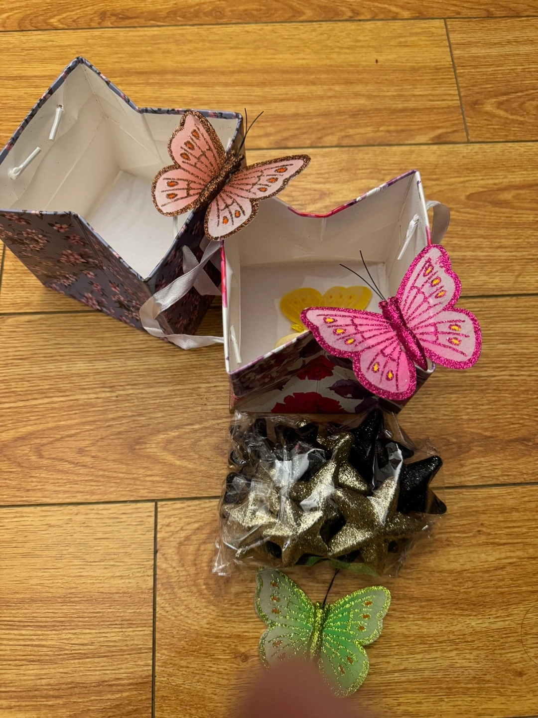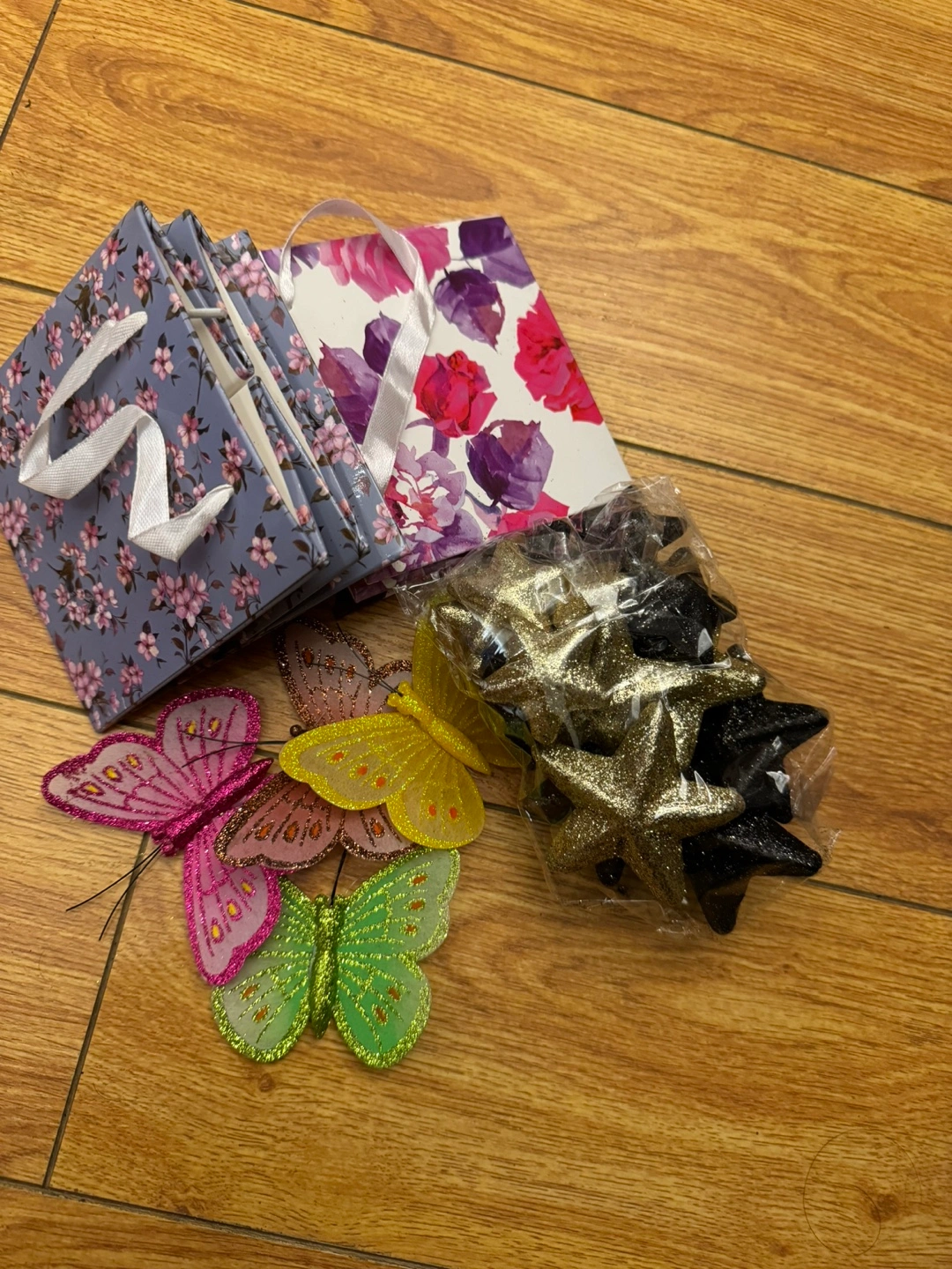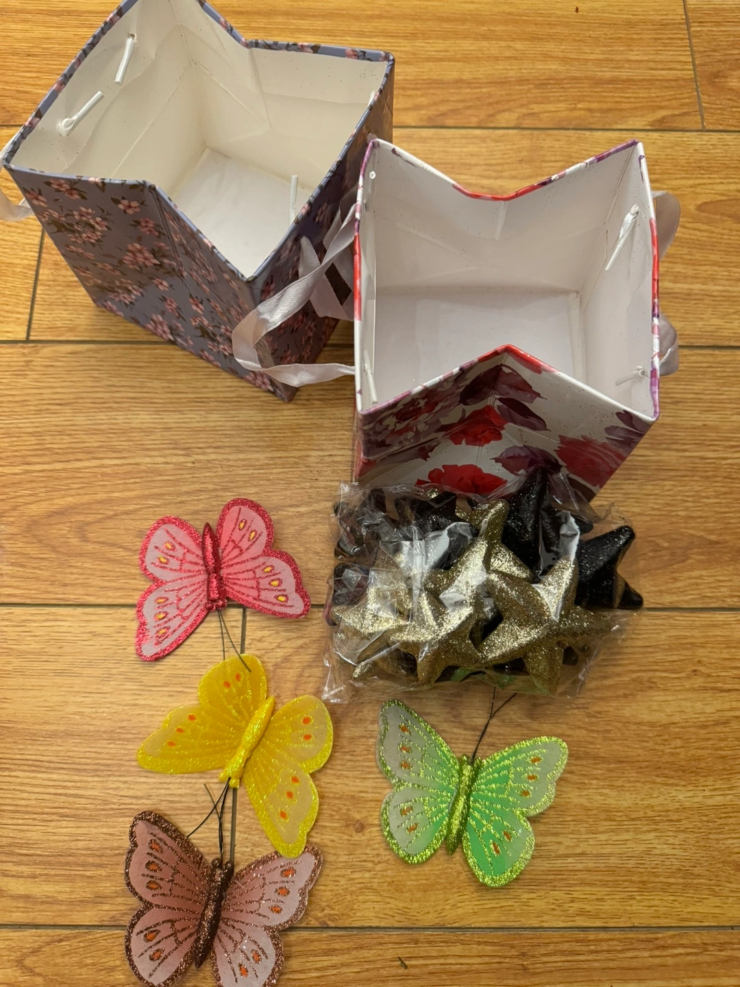Set of two floral gift bags with satin ribbon handles. Includes four glittery butterflies and package of sparkly stars.