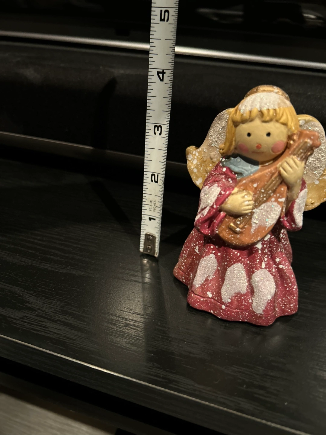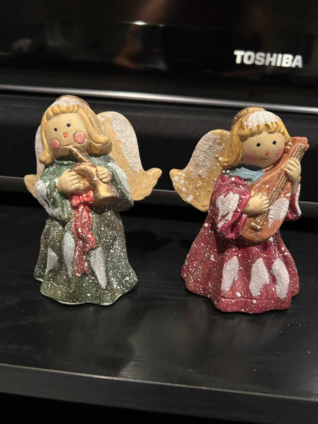 Pristine condition. Set of two Christmas angel figurines. One playing a trumpet and the other a lute. Approximately 4 inches tall.