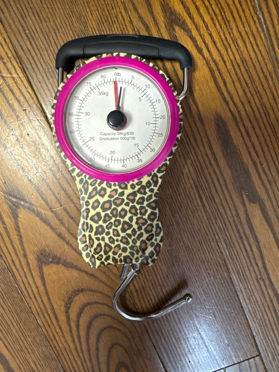 Portable luggage scale with leopard print design, silver hook, and pink face. Scale is in kilograms and pounds.