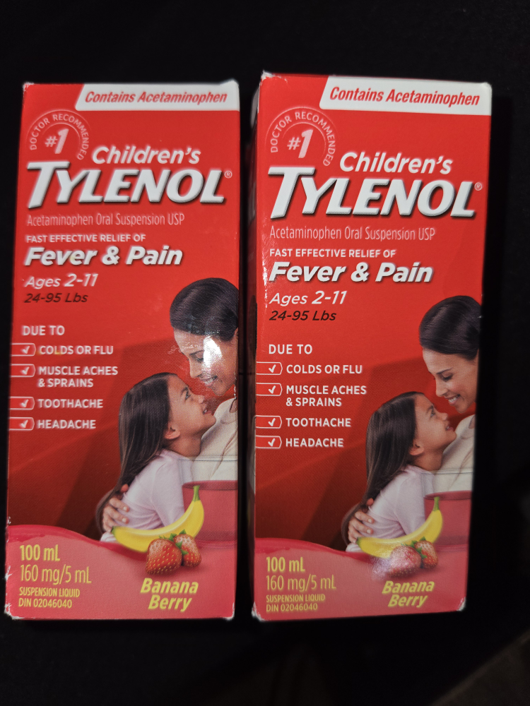 Two bottles of Children's TYLENOL Fever & Pain in Banana Berry flavour. 100mL each.