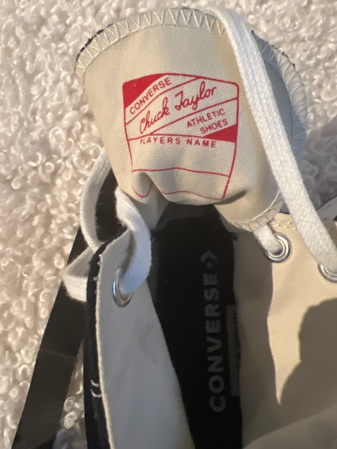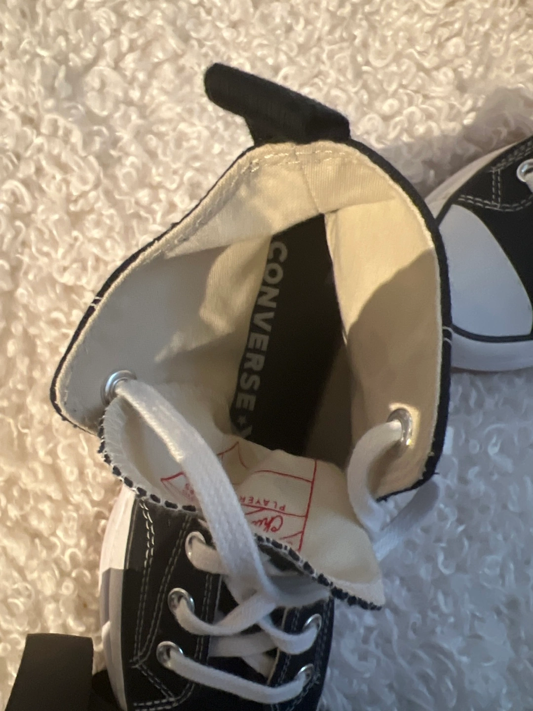 Black canvas high top sneakers with white sole and brown accents.