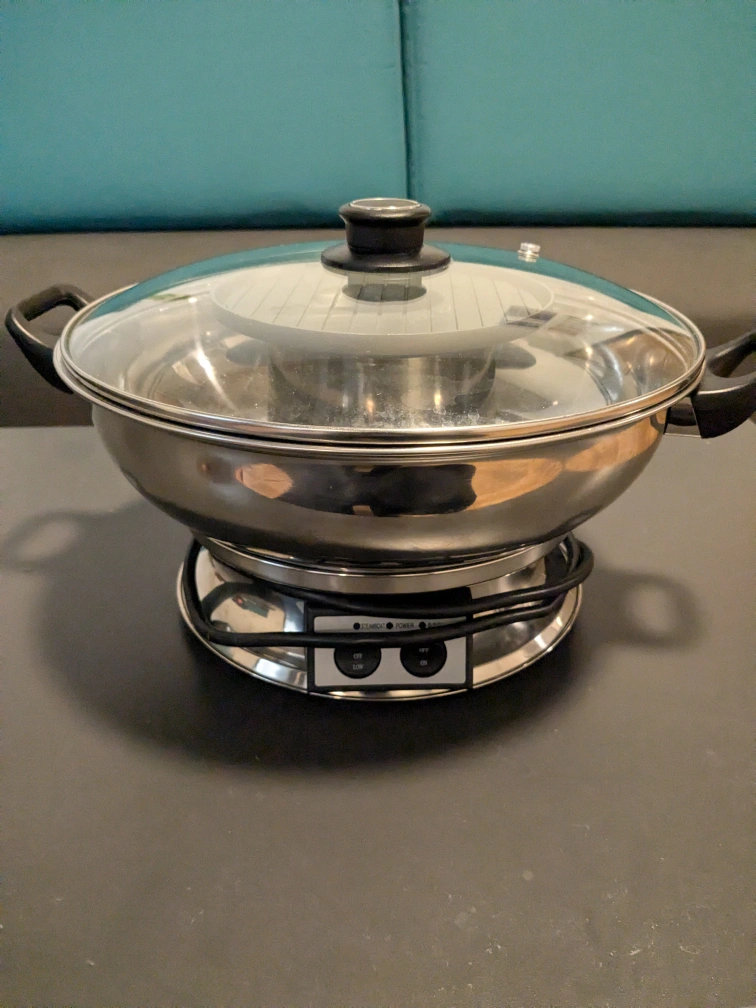 The hotpot has a grill in the center so you can fry and boil meat/veggies at the same time.