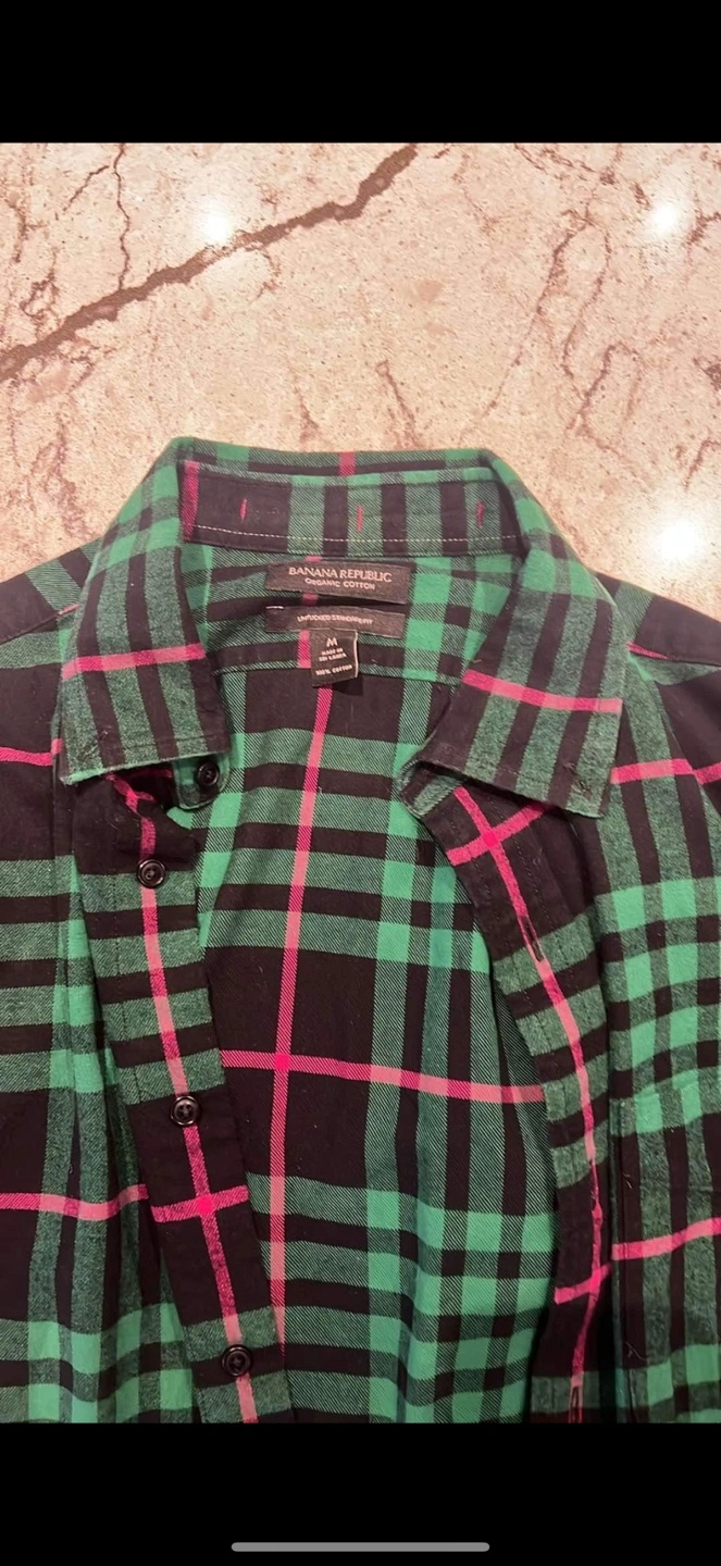 Long sleeve, green and pink plaid shirt with black accents. Size M. Tommy and banana republic
