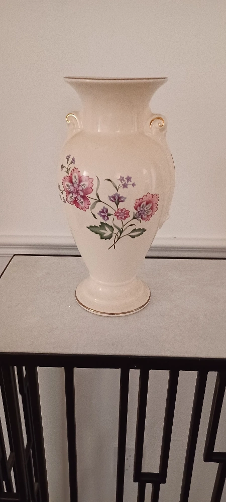 87Vintage glazed ceramic vase with floral design. Gold accents.