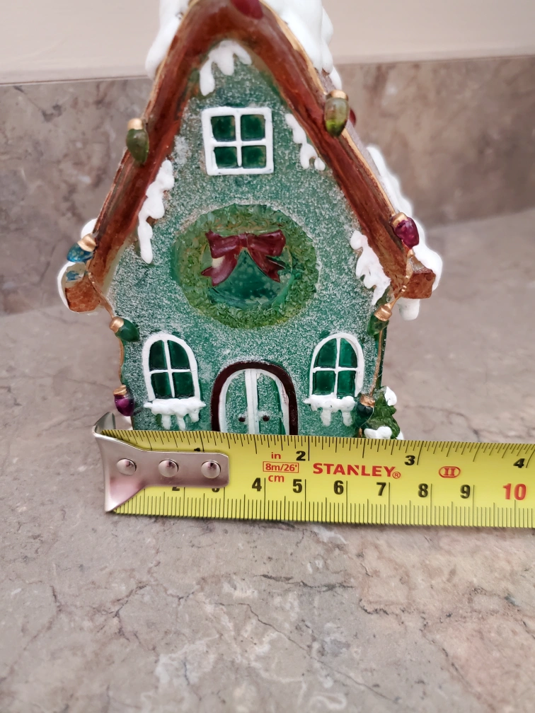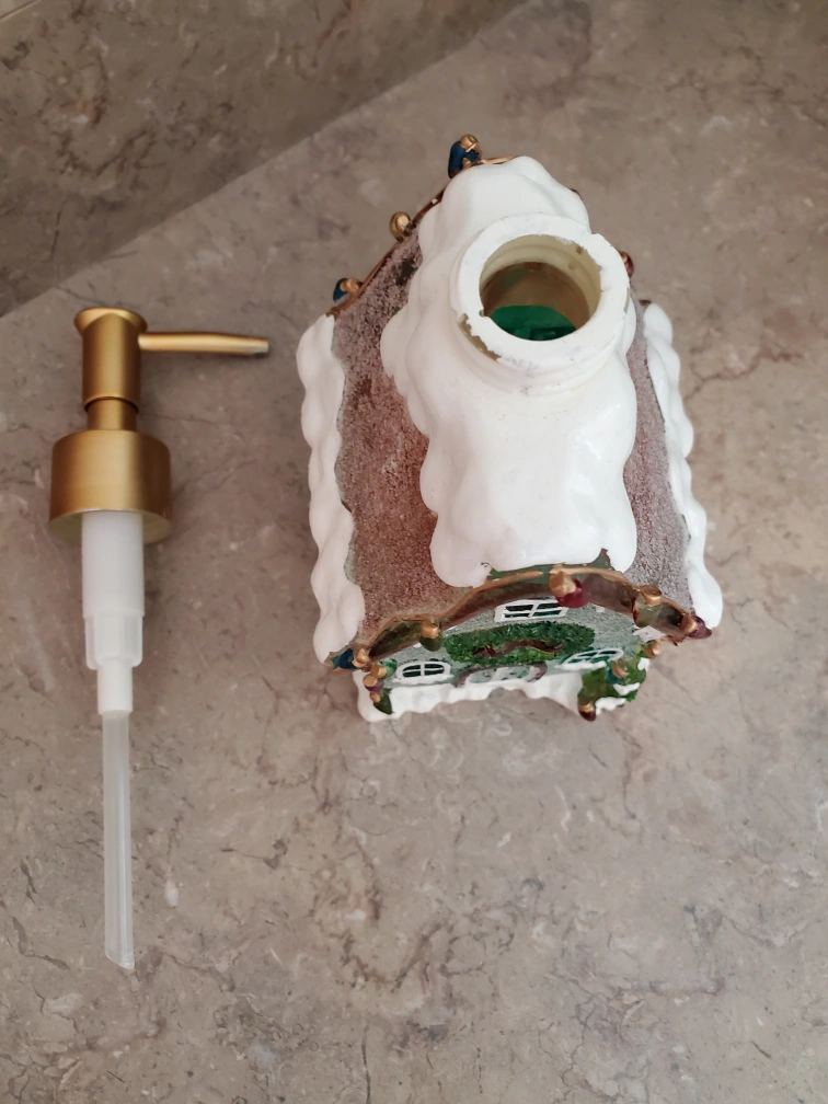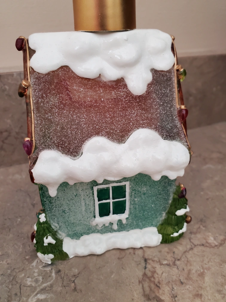 Super cute Christmas house soap dispenser. Works and in good condition. See last couple photos for dimensions.