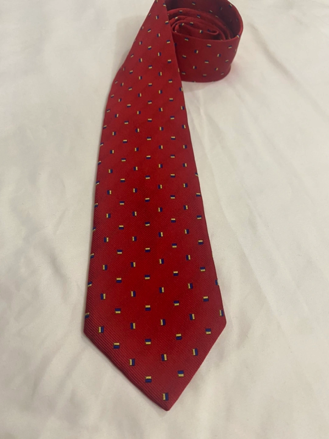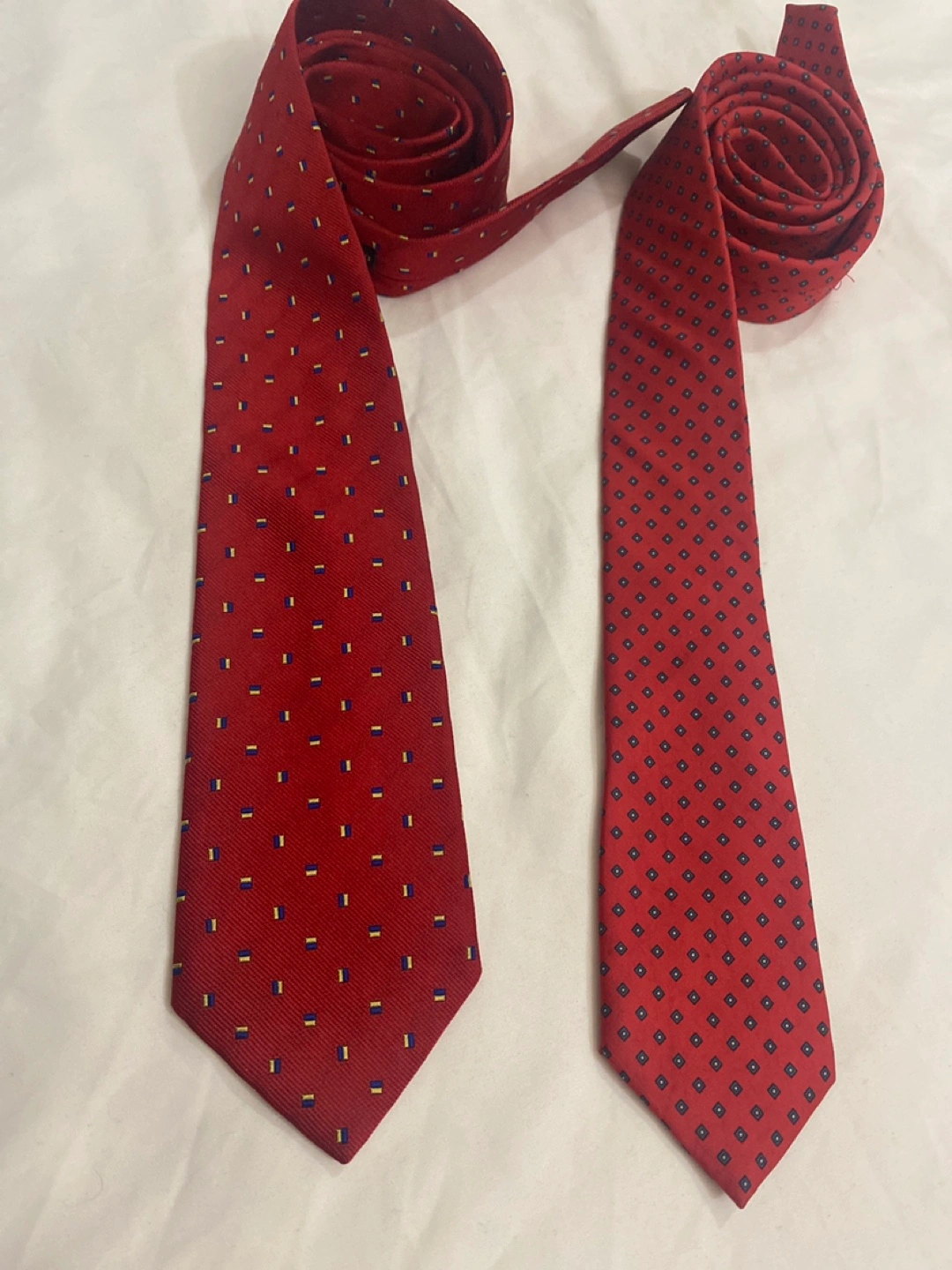 2 Silk Ties: Red with Blue and Yellow Pattern