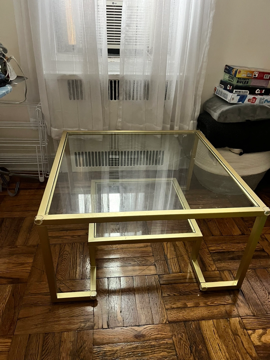 Glass top with gold metal frame. Includes a smaller shelf underneath. Good condition.