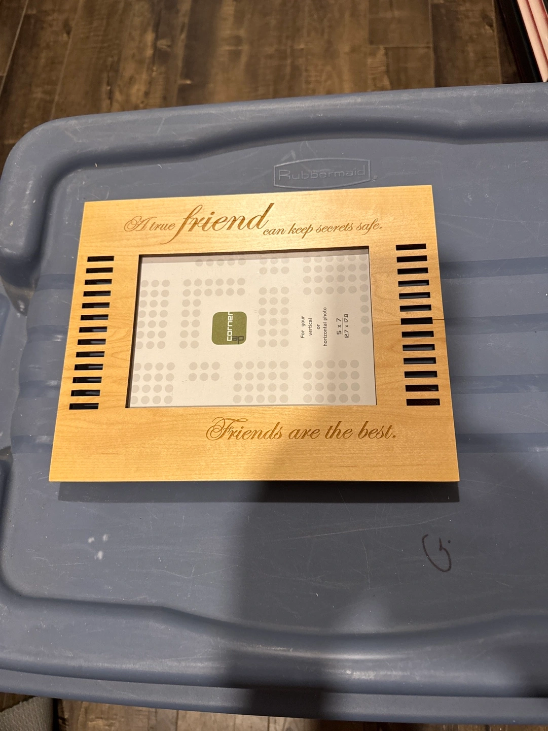 Wooden picture frame with a light brown stain. Features a laser-etched design with the saying "A true friend can keep secrets safe. Friends are the best."