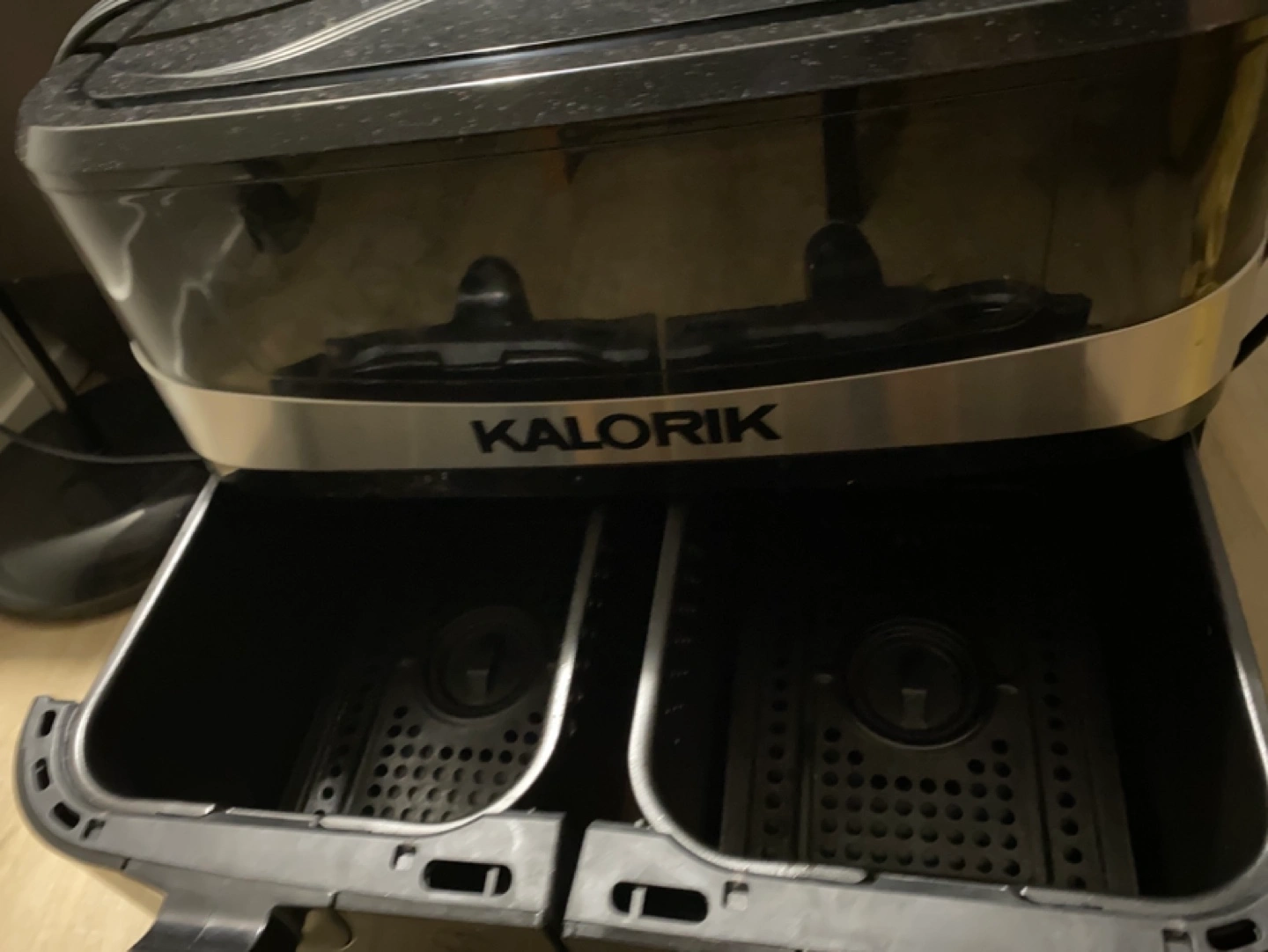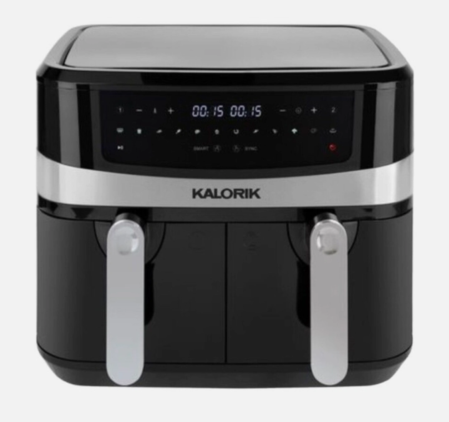 Double basket air fryer. Black with silver accents. Two 5QT each baskets, multiple preset settings
