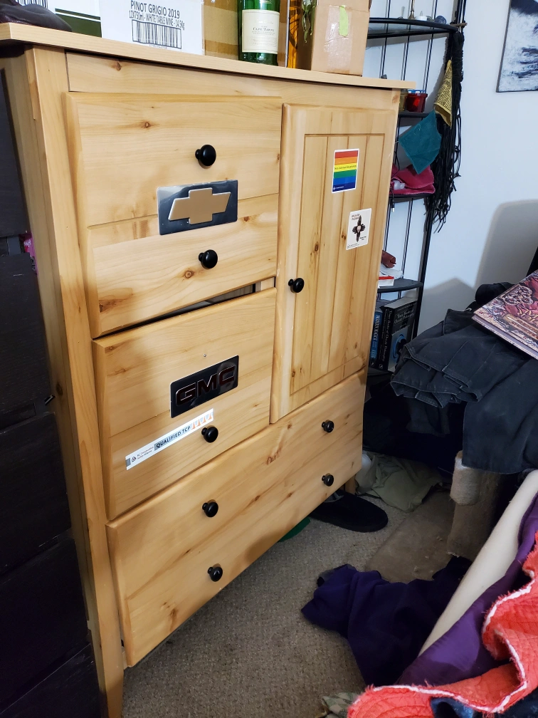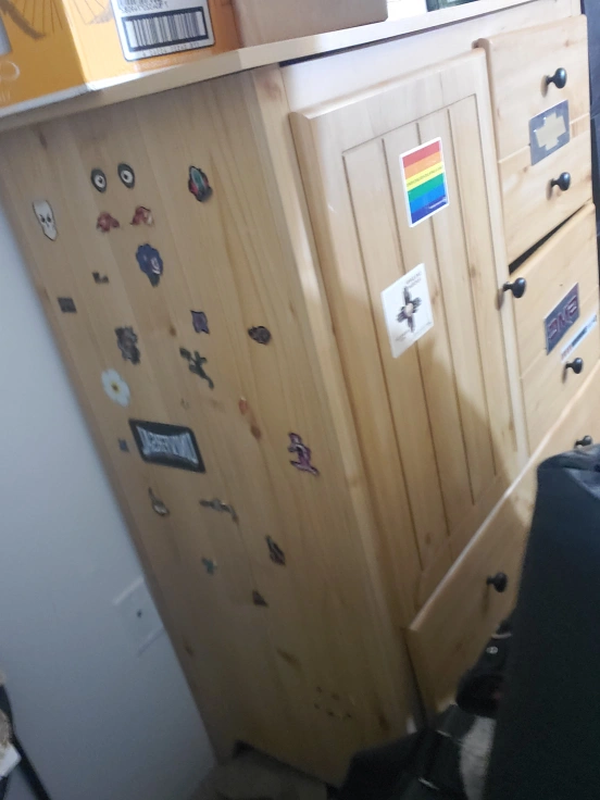 Cabinet with two drawers and a cabinet door. Three drawers total, they work but stick a bit. Pine finish with black knobs. Covered in stickers.