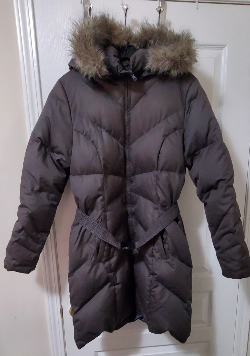 Infrequent wear, like new. Quality jacket. Very warm. Nice fit, tapered back. Detachable hood. Machine washable.