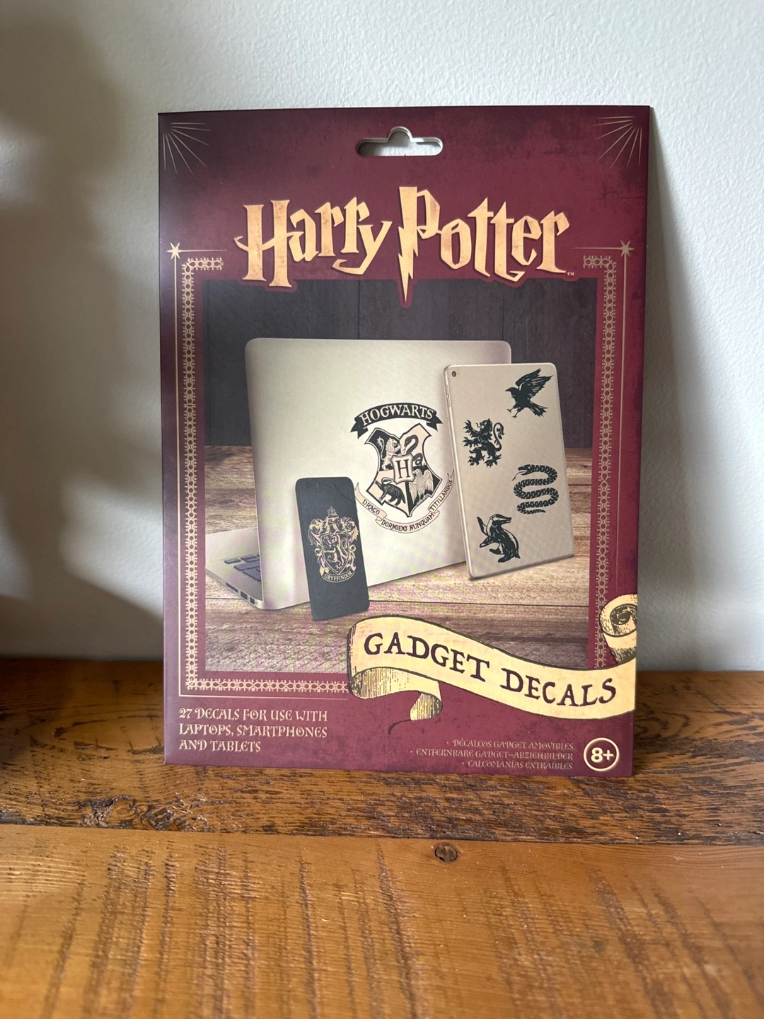 27 waterproof and removable decals for use with laptops, smartphones and tablets. Includes Hogwarts crest, house crests, and other Harry Potter symbols.