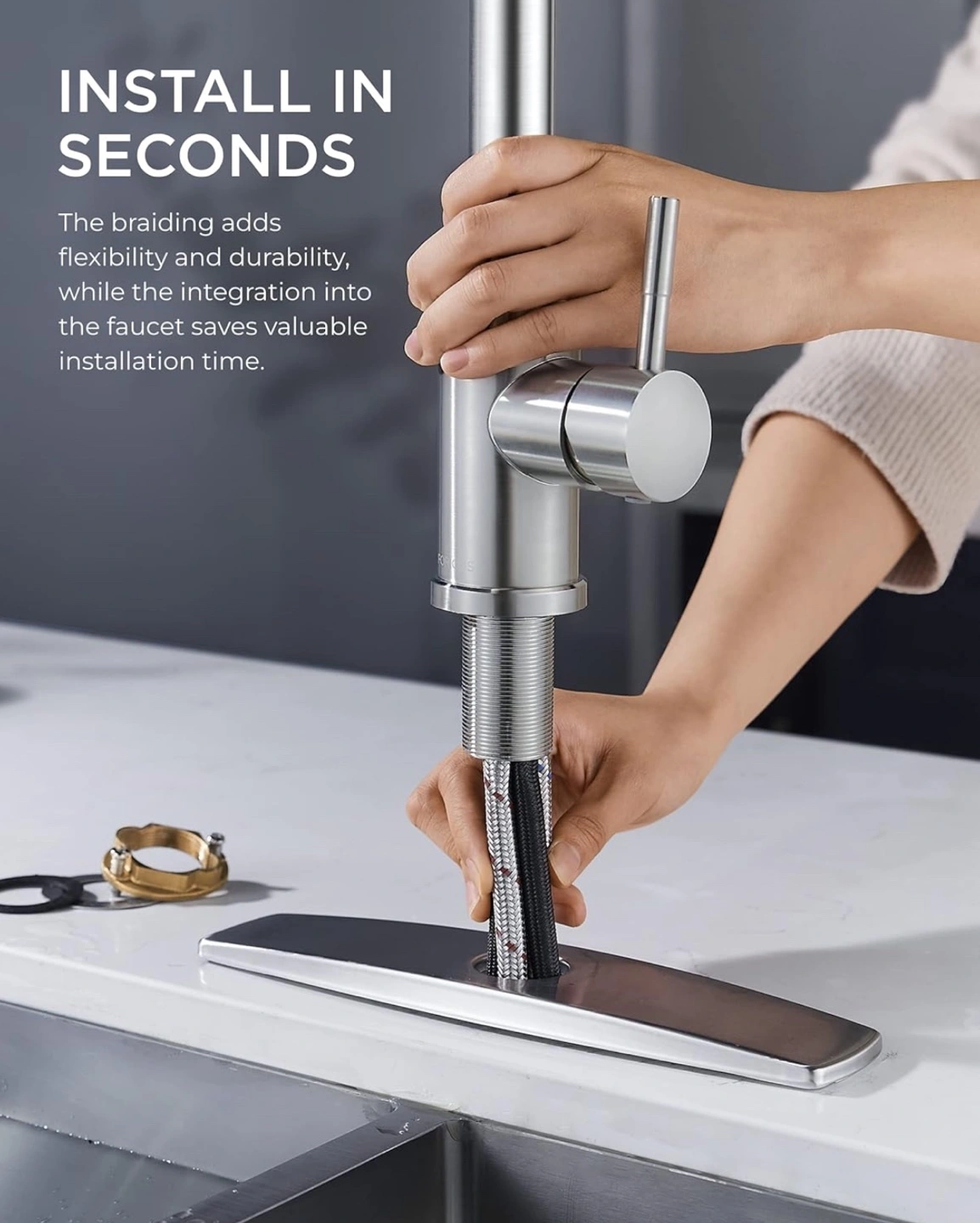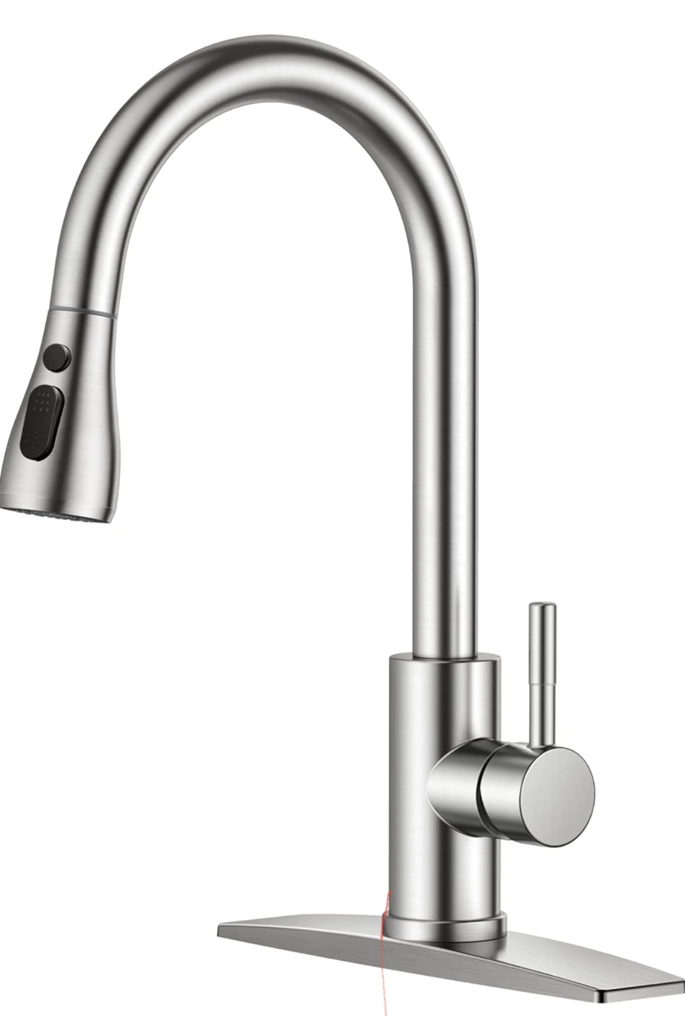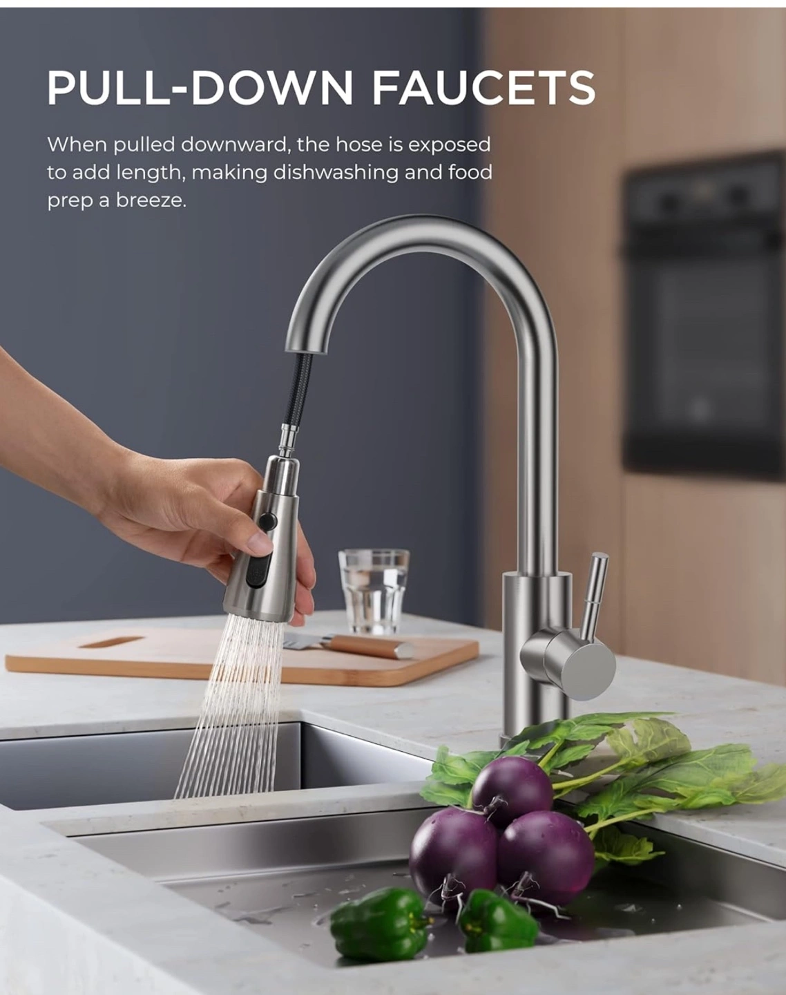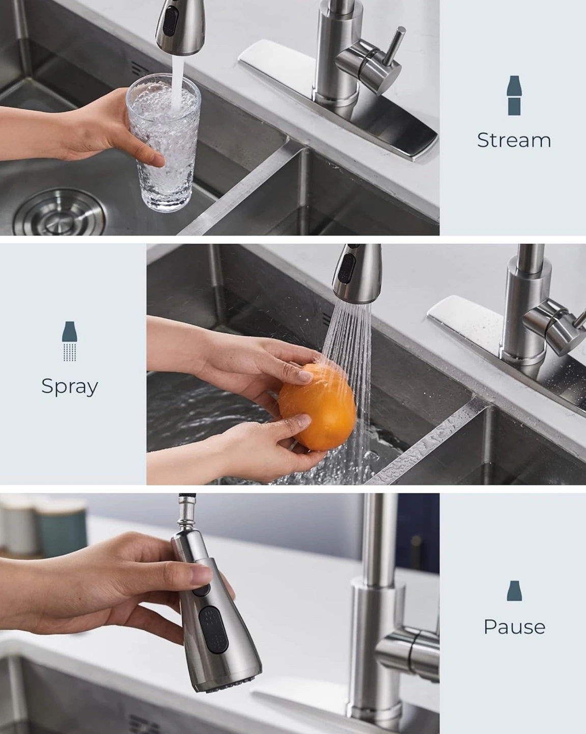 Single-handle kitchen faucet with pull-down sprayer. Features stream, spray and pause settings. Easy installation.