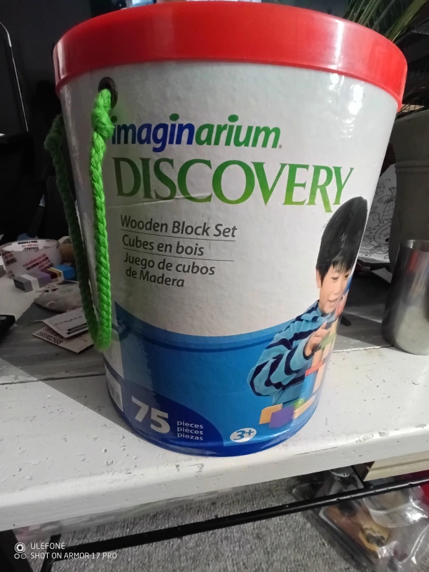 75 piece wooden block set, comes in a plastic bucket with a handle. 3+ years.
