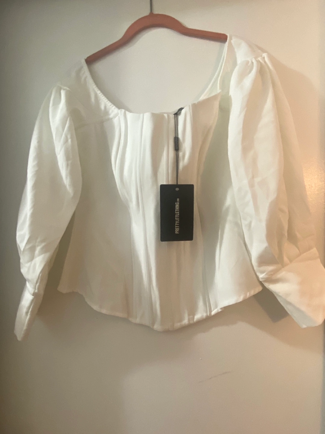 White corset top with long sleeves and a zipper closure in the back Puffy sleeves. Off the shoulder neckline.