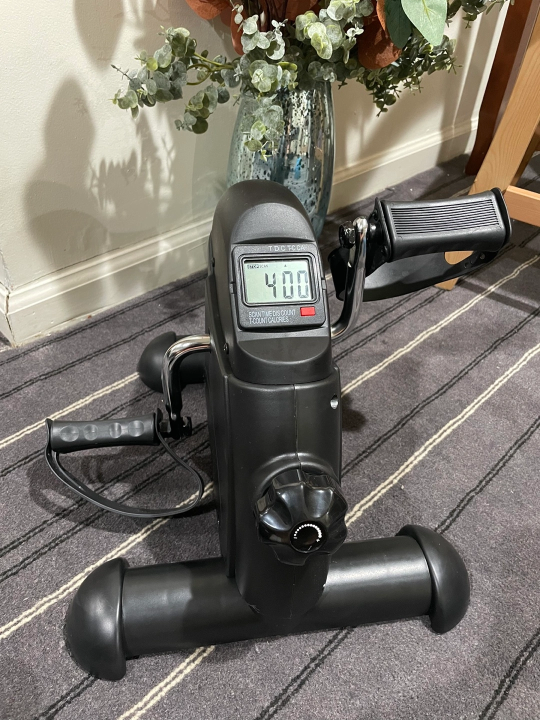Black mini exercise bike with digital display. Tracks scan time, distance count, and calories burned. Includes adjustable tension control.