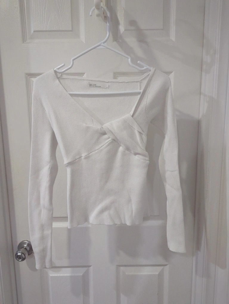 White long-sleeved top with a criss-cross detail at the front. Made of a soft ribbed fabric.